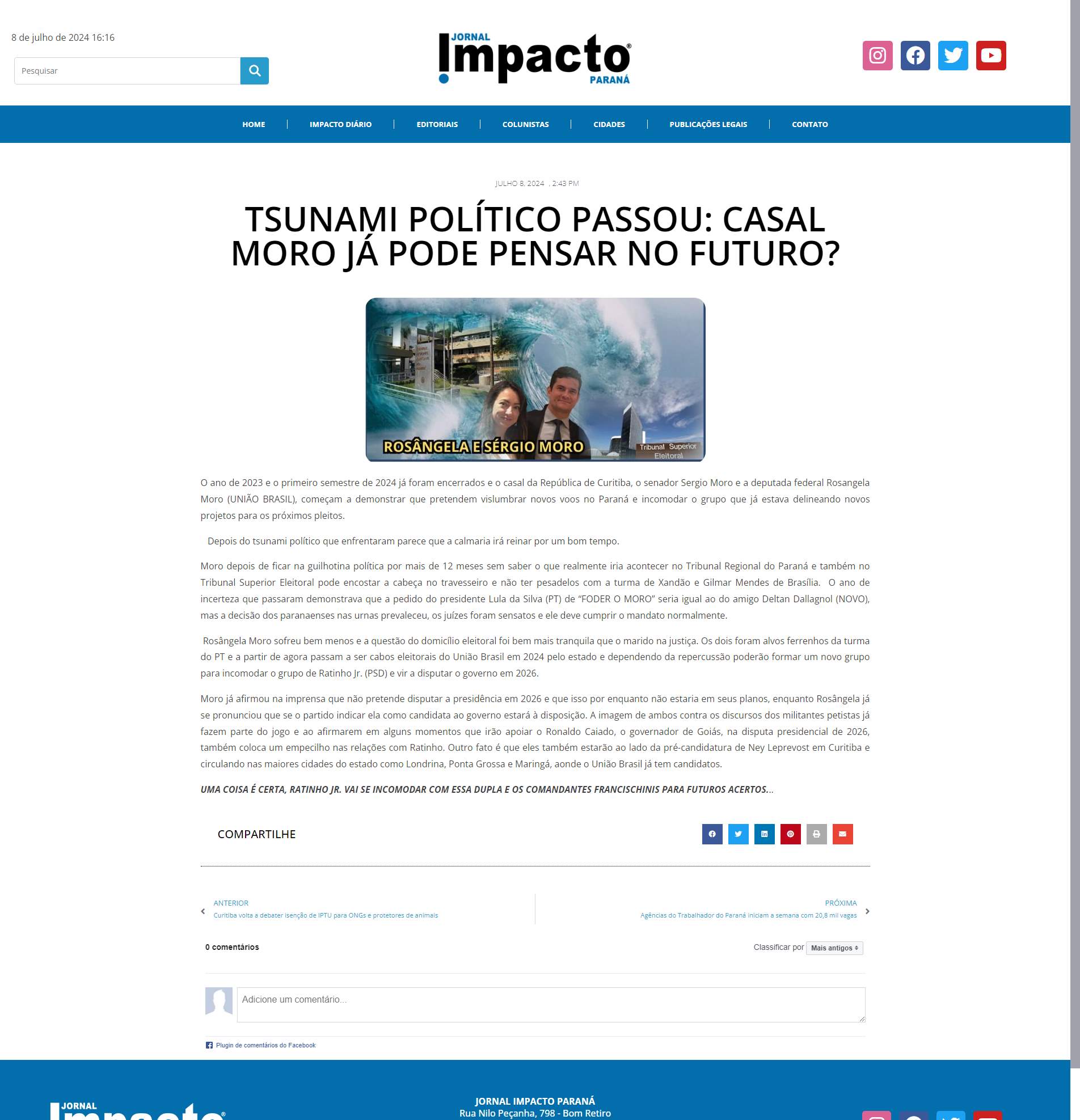 Rosângela Moro sofreu bem menos e a questão do domicílio eleitoral foi bem mais tranquila que o marido na justiça. Os dois foram alvos ferrenhos da turma do PT e a partir de agora passam a ser cabos eleitorais do União Brasil em 2024 pelo estado e dependendo da repercussão poderão formar um novo grupo para incomodar o grupo de