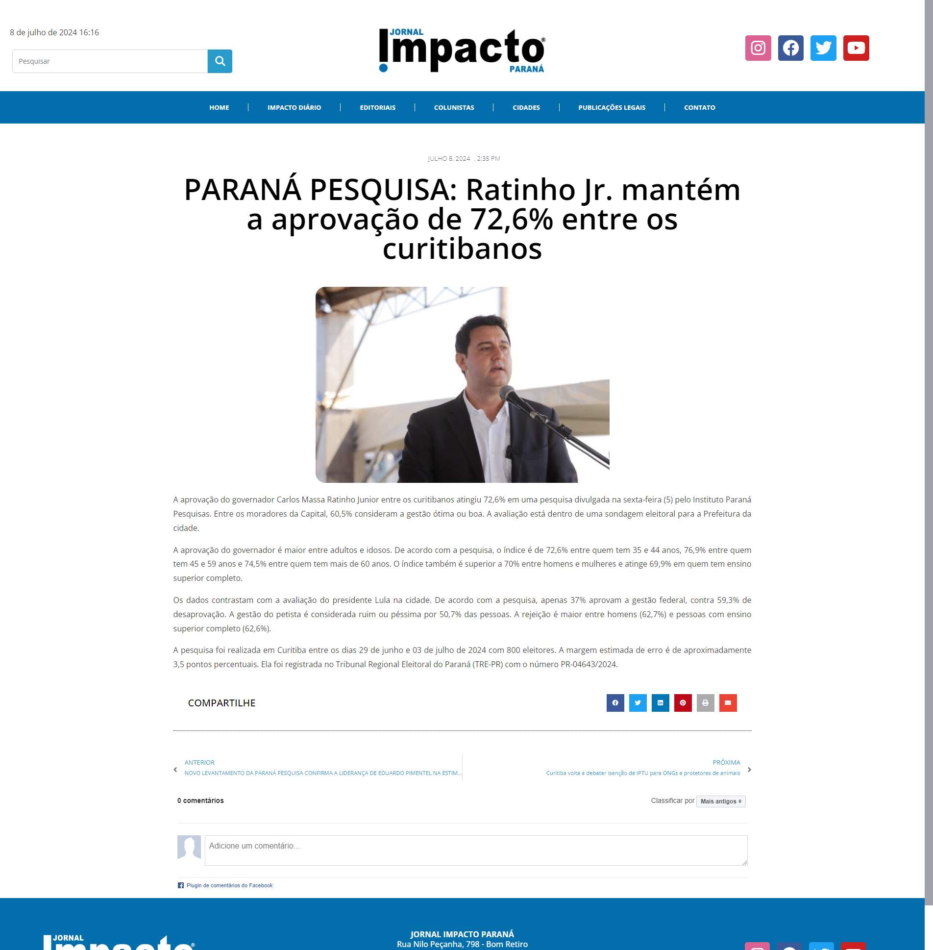 governador Carlos Massa Ratinho Junior entre os curitibanos atingiu 72,6% em uma pesquisa divulgada na sexta-feira (5) pelo Instituto