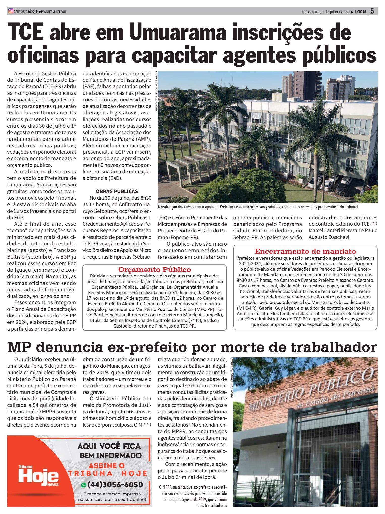 A Escola de Gestão Pública do Tribunal de Contas do Estado do Paraná (TCE-PR) abriu as inscrições para três oficinas de capacitação de agentes pú- blicos paranaenses que serão realizadas em Umuarama. Os cursos presenciais ocorrem entre os dias 30 de julho e 1º de agosto e tratarão de temas fundamentais para os administradores: obras públicas; vedações em período eleitoral e encerramento de mandato e orçamento público. A realização dos cursos tem o apoio da Prefeitura de Umuarama. As inscrições são gratuitas, como todos os eventos promovidos pelo Tribunal, e já estão disponíveis na aba de Cursos Presenciais no portal da EGP. Até o final do ano, esse “combo” de capacitações será ministrado em mais duas cidades do interior do estado: Maringá (agosto) e Francisco Beltrão (setembro). A EGP já realizou esses cursos em Foz do Iguaçu (em março) e Londrina (em maio). Na capital, as mesmas oficinas vêm sendo ministradas de forma individualizada, ao longo do ano. Esses encontros integram o Plano Anual de Capacitação dos Jurisdicionados do TCE-PR em 2024, elaborado pela EGP a partir das principais demanO Judiciário recebeu na última sexta-feira, 5 de julho, denúncia criminal oferecida pelo Ministério Público do Paraná contra o ex-prefeito e o secretário municipal de Compras e Licitações de Iporã (cidade localizada a 54 quilômetros de Umuarama). O MPPR sustenta que os dois são responsáveis diretos pelo evento ocorrido na das identificadas na execução do Plano Anual de Fiscalização (PAF), falhas apontadas pelas unidades técnicas nas presta- ções de contas, necessidades de atualização decorrentes de alterações legislativas, avaliações realizadas nos cursos oferecidos no ano passado e solicitação da Associação dos Municípios do Paraná (AMP). Além do ciclo de capacitação presencial, a EGP vai inserir, ao longo do ano, aproximadamente 80 novos conteúdos online, em sua área de educação a distância (EaD). OBRAS PÚBLICAS No dia 30 de julho, das 8h30 às 17 horas, no Anfiteatro Haruyo Setogutte, ocorrerá o encontro sobre Obras Públicas e Credenciamento Aplicado a Pequenos Reparos. A capacitação é resultado de parceria entre o TCE-PR, a seção estadual do Serviço Brasileiro de Apoio às Micro e Pequenas Empresas (Sebrae- -PR) e o Fórum Permanente das Microempresas e Empresas de Pequeno Porte do Estado do Paraná (Fopeme-PR). O público-alvo são micro e pequenos empresários interessados em contratar como poder público e municípios beneficiados pelo Programa Cidade Empreendedora, do Sebrae-PR. As palestras serão ministradas pelos auditores do controle externo do TCE-PR Marcel Lanteri Pierezan e Paulo Augusto Daschevi.