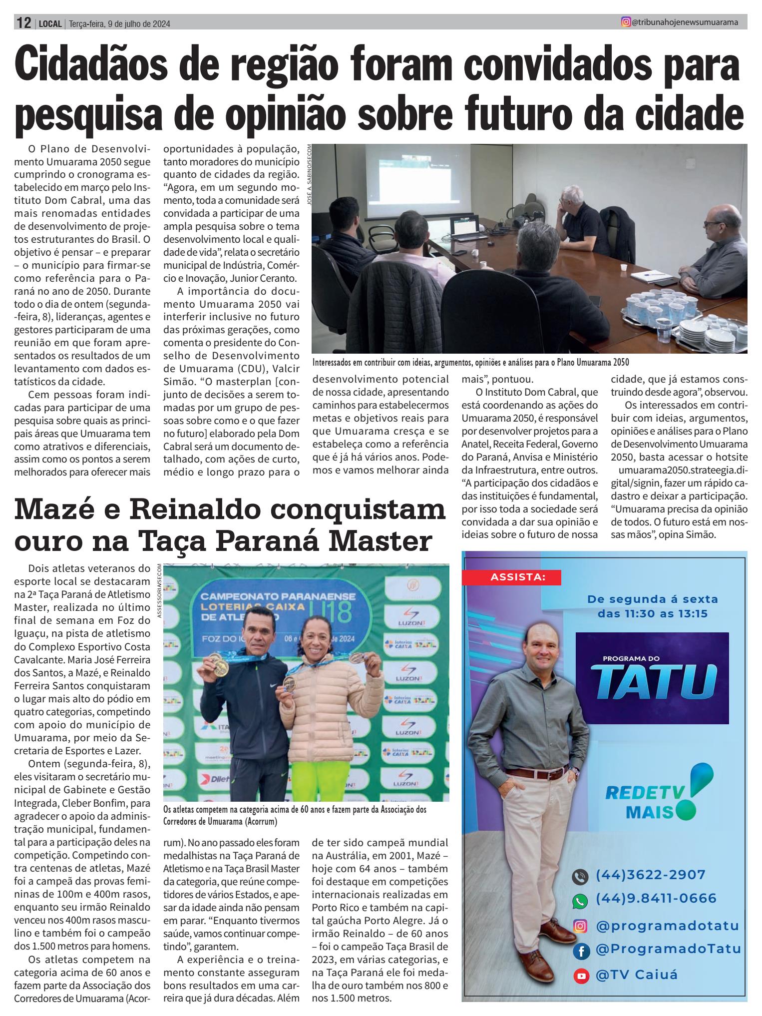 O Plano de Desenvolvimento Umuarama 2050 segue cumprindo o cronograma estabelecido em março pelo Instituto Dom Cabral, uma das mais renomadas entidades de desenvolvimento de projetos estruturantes do Brasil. O objetivo é pensar – e preparar – o município para firmar-se como referência para o Paraná no ano de 2050. Durante todo o dia de ontem (segunda- -feira, 8), lideranças, agentes e gestores participaram de uma reunião em que foram apresentados os resultados de um levantamento com dados estatísticos da cidade. Cem pessoas foram indicadas para participar de uma pesquisa sobre quais as principais áreas que Umuarama tem como atrativos e diferenciais, assim como os pontos a serem melhorados para oferecer maisoportunidades à população, tanto moradores do município quanto de cidades da região. “Agora, em um segundo momento, toda a comunidade será convidada a participar de uma ampla pesquisa sobre o tema desenvolvimento local e qualidade de vida”, relata o secretário municipal de Indústria, Comércio e Inovação, Junior Ceranto. A importância do documento Umuarama 2050 vai interferir inclusive no futuro das próximas gerações, como comenta o presidente do Conselho de Desenvolvimento de Umuarama (CDU), Valcir Simão. “O masterplan [conjunto de decisões a serem tomadas por um grupo de pessoas sobre como e o que fazer no futuro] elaborado pela Dom Cabral será um documento detalhado, com ações de curto, médio e longo prazo para o desenvolvimento potencial de nossa cidade, apresentando caminhos para estabelecermos metas e objetivos reais para que Umuarama cresça e se estabeleça como a referência que é já há vários anos. Podemos e vamos melhorar ainda mais”, pontuou. O Instituto Dom Cabral, que está coordenando as ações do Umuarama 2050, é responsável por desenvolver projetos para a Anatel, Receita Federal, Governo do Paraná, Anvisa e Ministério da Infraestrutura, entre outros. “A participação dos cidadãos e das instituições é fundamental, por isso toda a sociedade será convidada a dar sua opinião e ideias sobre o futuro de nossa rum). No ano passado eles foram medalhistas na Taça Paraná de Atletismo e na Taça Brasil Master da categoria, que reúne competidores de vários Estados, e apesar da idade ainda não pensam em parar. “Enquanto tivermos saúde, vamos continuar competindo”, garantem. A experiência e o treinamento constante asseguram bons resultados em uma carreira que já dura décadas. Além de ter sido campeã mundial na Austrália, em 2001, Mazé – hoje com 64 anos – também foi destaque em competições internacionais realizadas em Porto Rico e também na capital gaúcha Porto Alegre. Já o irmão Reinaldo – de 60 anos – foi o campeão Taça Brasil de 2023, em várias categorias, e na Taça Paraná ele foi medalha de ouro também nos 800 e nos 1.500 metros. Interessados em contribuir com ideias, argumentos, opiniões e análises para o Plano Umuarama 2050 JOSÉ A. SABINO/SECOM cidade, que já estamos construindo desde agora”, observou. Os interessados em contribuir com ideias, argumentos, opiniões e análises para o Plano de Desenvolvimento Umuarama 2050, basta acessar o hotsite umuarama2050.strateegia.digital/signin, fazer um rápido cadastro e deixar a participação. “Umuarama precisa da opinião de todos. O futuro está em nossas mãos”, opina Simão