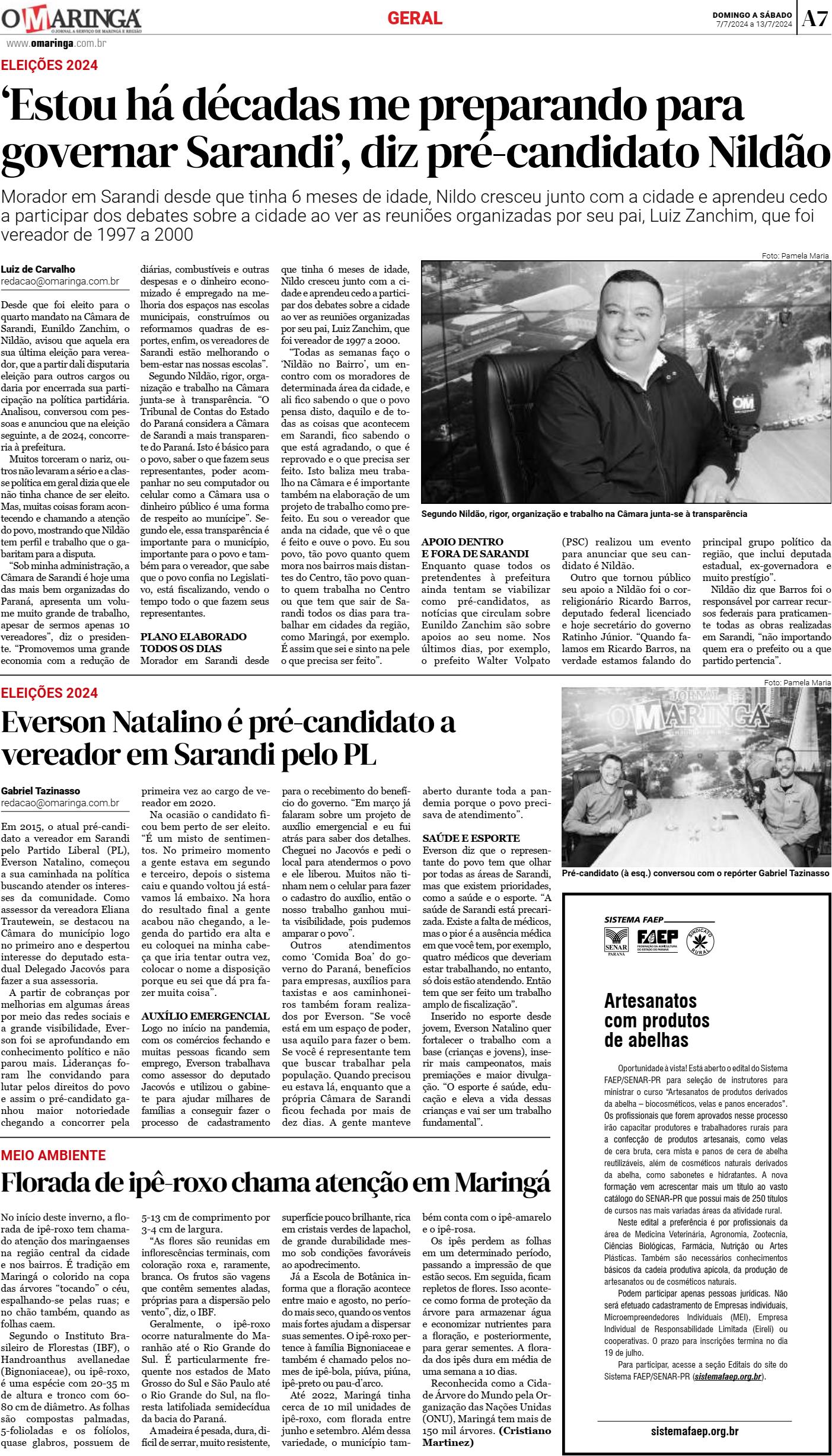 Desde que foi eleito para o quarto mandato na Câmara de Sarandi, Eunildo Zanchim, o Nildão, avisou que aquela era sua última eleição para vereador, que a partir dali disputaria eleição para outros cargos ou daria por encerrada sua participação na política partidária. Analisou, conversou com pessoas e anunciou que na eleição seguinte, a de 2024, concorreria à prefeitura. Muitos torceram o nariz, outros não levaram a sério e a classe política em geral dizia que ele não tinha chance de ser eleito. Mas, muitas coisas foram acontecendo e chamando a atenção do povo, mostrando que Nildão tem perfil e trabalho que o gabaritam para a disputa. “Sob minha administração, a Câmara de Sarandi é hoje uma das mais bem organizadas do Paraná, apresenta um volume muito grande de trabalho, apesar de sermos apenas 10 vereadores”, diz o presidente. “Promovemos uma grande economia com a redução dediárias, combustíveis e outras despesas e o dinheiro economizado é empregado na melhoria dos espaços nas escolas municipais, construímos ou reformamos quadras de esportes, enfim, os vereadores de Sarandi estão melhorando o bem-estar nas nossas escolas”. Segundo Nildão, rigor, organização e trabalho na Câmara junta-se à transparência. “O Tribunal de Contas do Estado do Paraná considera a Câmara de Sarandi a mais transparente do Paraná. Isto é básico para o povo, saber o que fazem seus representantes, poder acompanhar no seu computador ou celular como a Câmara usa o dinheiro público é uma forma de respeito ao munícipe”. Segundo ele, essa transparência é importante para o município, importante para o povo e também para o vereador, que sabe que o povo confia no Legislativo, está fiscalizando, vendo o tempo todo o que fazem seus representantes. PLANO ELABORADO TODOS OS DIAS Morador em Sarandi desde que tinha 6 meses de idade, Nildo cresceu junto com a cidade e aprendeu cedo a participar dos debates sobre a cidade ao ver as reuniões organizadas por seu pai, Luiz Zanchim, que foi vereador de 1997 a 2000. “Todas as semanas faço o ‘Nildão no Bairro’, um encontro com os moradores de determinada área da cidade, e ali fico sabendo o que o povo pensa disto, daquilo e de todas as coisas que acontecem em Sarandi, fico sabendo o que está agradando, o que é reprovado e o que precisa ser feito. Isto baliza meu trabalho na Câmara e é importante também na elaboração de um projeto de trabalho como prefeito. Eu sou o vereador que anda na cidade, que vê o que é feito e ouve o povo. Eu sou povo, tão povo quanto quem mora nos bairros mais distantes do Centro, tão povo quanto quem trabalha no Centro ou que tem que sair de Sarandi todos os dias para trabalhar em cidades da região, como Maringá, por exemplo. É assim que sei e sinto na pele o que precisa ser feito”. GERAL APOIO DENTRO E FORA DE SARANDI Enquanto quase todos os pretendentes à prefeitura ainda tentam se viabilizar como pré-candidatos, as notícias que circulam sobre Eunildo Zanchim são sobre apoios ao seu nome. Nos últimos dias, por exemplo, o prefeito Walter Volpato (PSC) realizou um evento para anunciar que seu candidato é Nildão. Outro que tornou público seu apoio a Nildão foi o correligionário Ricardo Barros, deputado federal licenciado e hoje secretário do governo Ratinho Júnior. “Quando falamos em Ricardo Barros, na verdade estamos falando do principal grupo político da região, que inclui deputada estadual, ex-governadora e muito prestígio”. Nildão diz que Barros foi o responsável por carrear recursos federais para praticamente todas as obras realizadas em Sarandi, “não importando quem era o prefeito ou a que partido pertencia”.