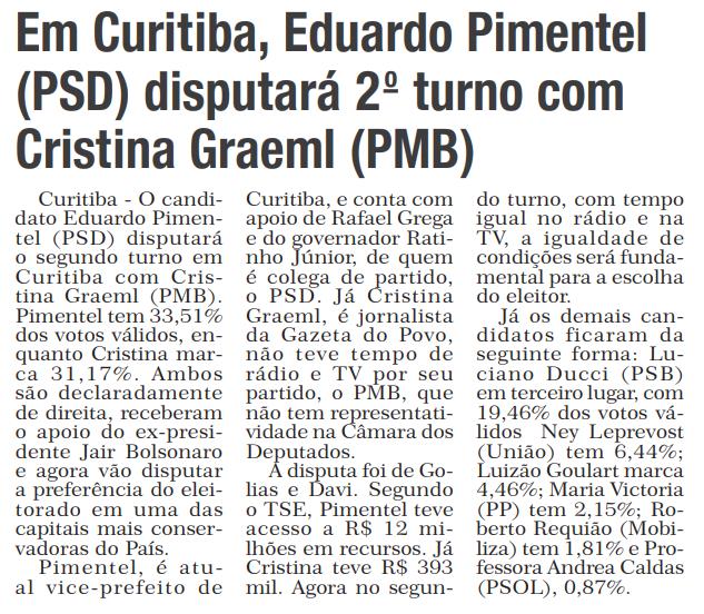 Curitiba - O candidato Eduardo Pimentel (PSD) disputará o segundo turno em Curitiba com Cristina Graeml (PMB). Pimentel tem 33,51% dos votos válidos, enquanto Cristina marca 31,17%. Ambos são declaradamente de direita, receberam o apoio do ex-presidente Jair Bolsonaro e agora vão disputar a preferência do eleitorado em uma das capitais mais conservadoras do País. Pimentel, é atual vice-prefeito de Curitiba, e conta com apoio de Rafael Grega e do governador Ratinho Júnior, de quem é colega de partido, o PSD. Já Cristina Graeml, é jornalista da Gazeta do Povo, não teve tempo de rádio e TV por seu partido, o PMB, que não tem representatividade na Câmara dos Deputados. A disputa foi de Golias e Davi. Segundo o TSE, Pimentel teve acesso a R$ 12 milhões em recursos. Já Cristina teve R$ 393 mil. Agora no segundo turno, com tempo igual no rádio e na TV, a igualdade de condições será fundamental para a escolha do eleitor. Já os demais candidatos ficaram da seguinte forma: Luciano Ducci (PSB) em terceiro lugar, com 19,46% dos votos válidos Ney Leprevost (União) tem 6,44%; Luizão Goulart marca 4,46%; Maria Victoria (PP) tem 2,15%; Roberto Requião (Mobiliza) tem 1,81% e Professora Andrea Caldas (PSOL), 0,87%.