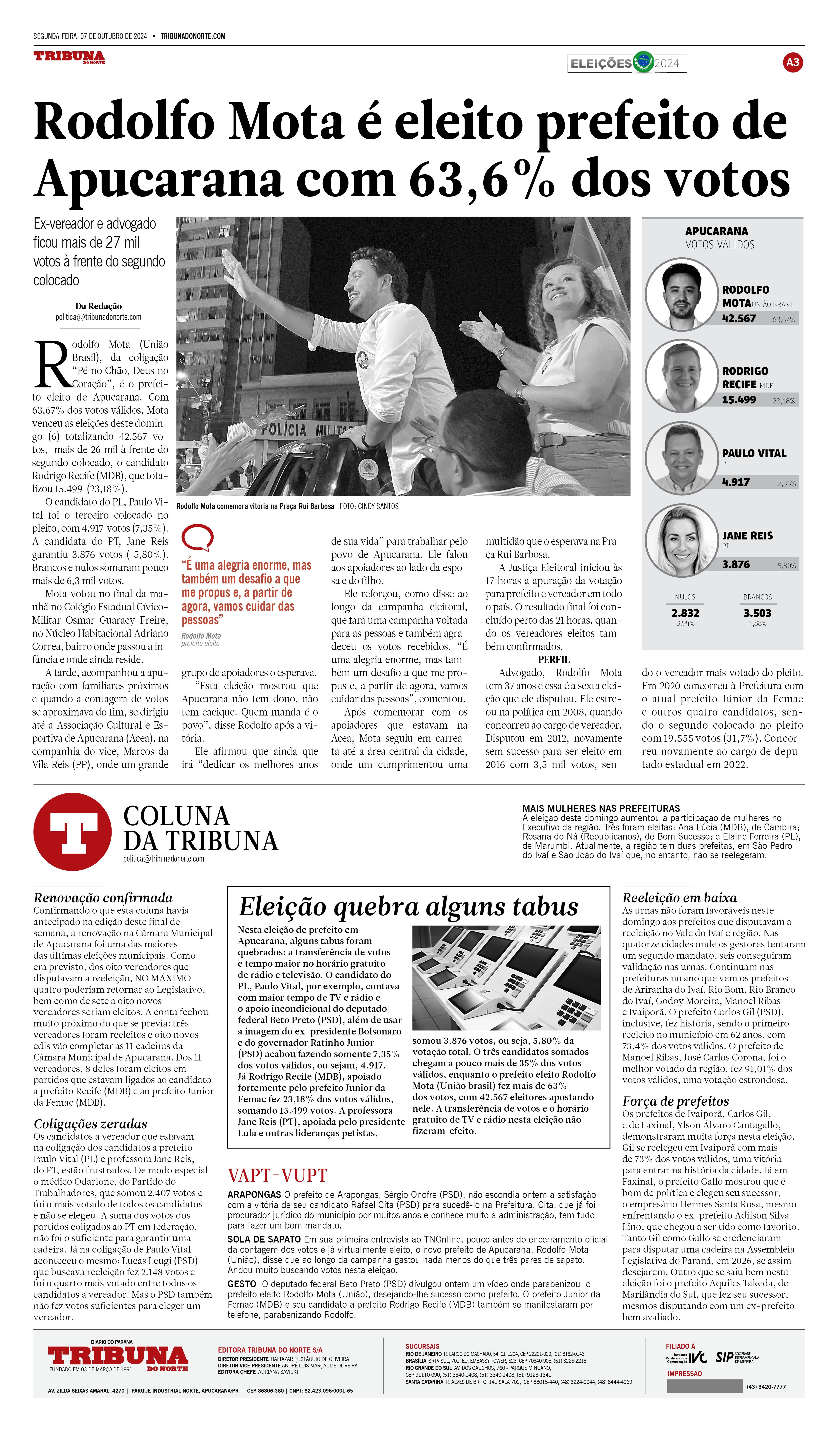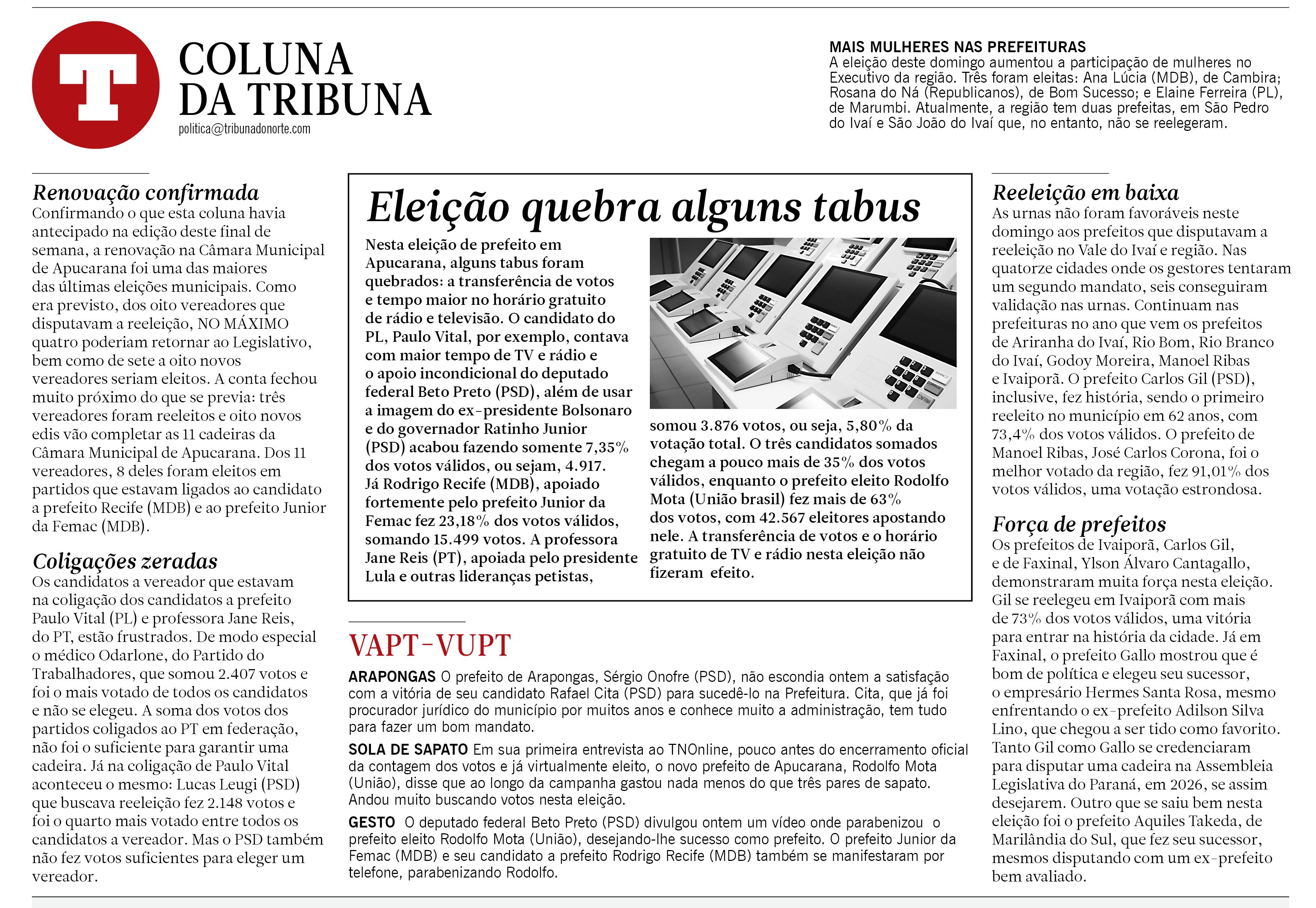 Nesta eleição de prefeito em Apucarana, alguns tabus foram quebrados: a transferência de votos e tempo maior no horário gratuito de rádio e televisão. O candidato do PL, Paulo Vital, por exemplo, contava com maior tempo de TV e rádio e o apoio incondicional do deputado federal Beto Preto (PSD), além de usar a imagem do ex-presidente Bolsonaro e do governador Ratinho Junior (PSD) acabou fazendo somente 7,35% dos votos válidos, ou sejam, 4.917. Já Rodrigo Recife (MDB), apoiado fortemente pelo prefeito Junior da Femac fez 23,18% dos votos válidos, somando 15.499 votos. A professora Jane Reis (PT), apoiada pelo presidente Lula e outras lideranças petistas, somou 3.876 votos, ou seja, 5,80% da votação total. O três candidatos somados chegam a pouco mais de 35% dos votos válidos, enquanto o prefeito eleito Rodolfo Mota (União brasil) fez mais de 63% dos votos, com 42.567 eleitores apostando nele. A transferência de votos e o horário gratuito de TV e rádio nesta eleição não fizeram efeito.