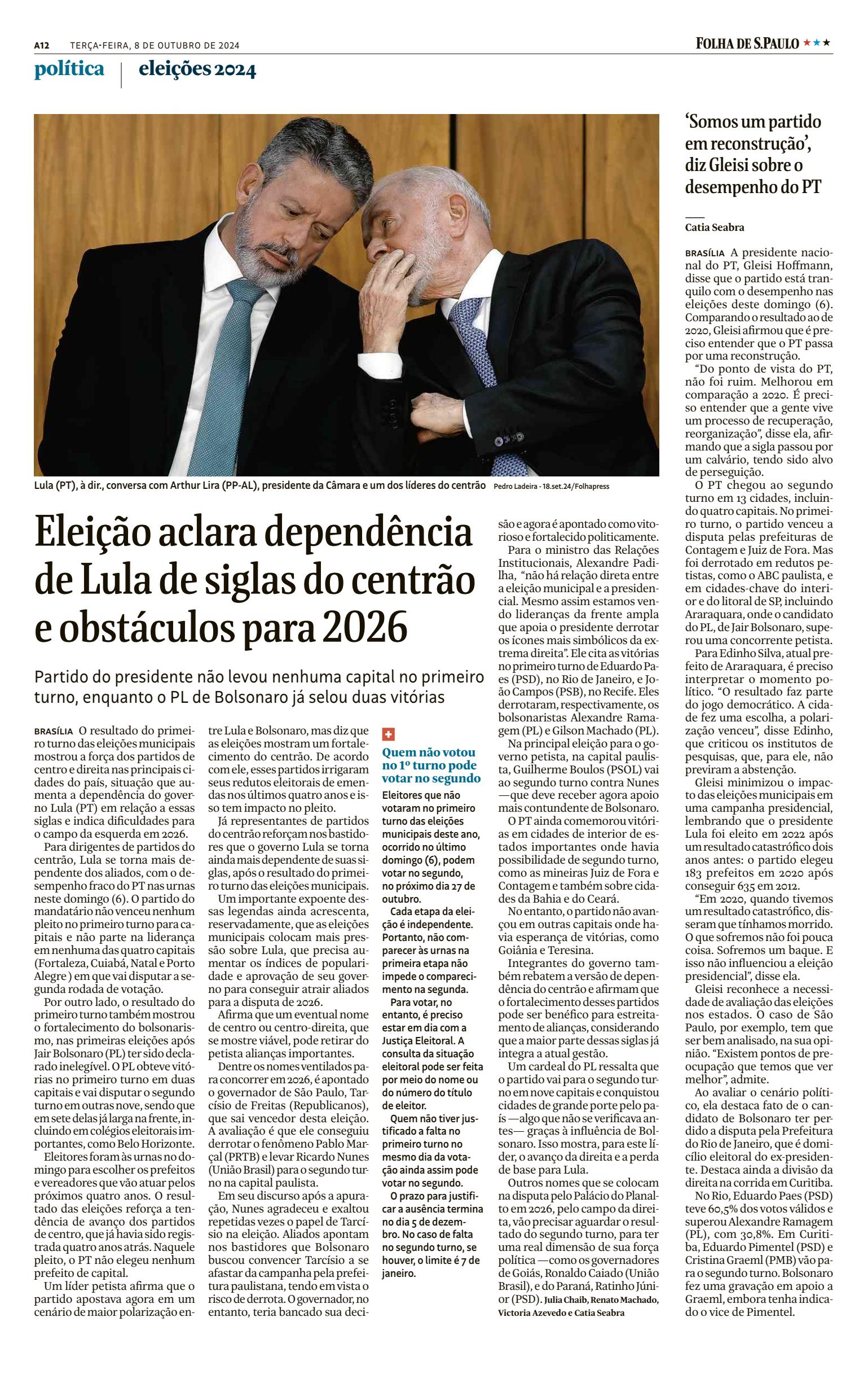 Para dirigentes de partidos do centrão, Lula se torna mais dependente dos aliados, com o desempenho fraco do PT nas urnas neste domingo (6). O partido do mandatário não venceu nenhum pleito no primeiro turno para capitais e não parte na liderança em nenhuma das quatro capitais em que vai disputar a segunda rodada de votação.