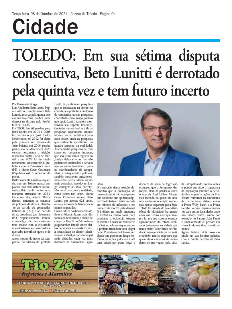 Luis Adalberto Beto Lunitti Pagnussatti, ou simplesmente Beto Lunitti, amarga pela quinta vez, em sua trajetória política, uma derrota na disputa pela Prefeitura de Toledo. Em 2000, Lunitti perdeu para Derli Donin; em 2004 e 2008 foi derrotado por José Carlos Schiavinato; em 2012 foi eleito pela primeira vez, derrotando João Poletto; em 2016 perdeu para Lucio de Marchi; em 2020 venceu novamente a eleição, disputada contra Lucio de Marchi; e em 2024 foi derrotado novamente, concorrendo à prefeitura contra Professora Nelsi (PT) e Mario César Costenaro (Republicanos), o vencedor do pleito. Historicamente ligado à esquerda, que em Toledo nunca emplacou uma candidatura ao Executivo, Beto Lunitti tentou uma manobra arriscada em 2024. Ele e seu vice, Ademar Dorfschmidt, tentaram se travestir de políticos de direita, filiando- -se ao partido do governador Ratinho Jr (PSD) e ao partido do ex-presidente Jair Bolsonaro (PL), respectivamente. Porém, a estratégia não deu certo em uma cidade com o eleitorado majoritariamente conservador e que sabe identificar quem é de direita. Antes mesmo do início da campanha, partidários do prefeito Lunitti já publicavam pesquisas que o colocavam na frente na corrida pela prefeitura. Ao longo da campanha, outras pesquisas contratadas pelo grupo político que apoia Lunitti também mostravam sua suposta liderança. Contudo, na reta final as últimas pesquisas apontavam empate técnico entre Lunitti e Costenaro (essas eram as pesquisas que realmente apontavam um quadro próximo da realidade). As chamadas pesquisas de consumo ou pesquisas internas, que são feitas sem o registro na Justiça Eleitoral (e por isso não podem ser publicadas) e servem apenas como termômetro para os coordenadores de campanhas e marqueterios políticos, também mostravam empate técnico entre Beto e Mario. As demais pesquisas, que davam longa vantagem ao atual prefeito, não condiziam com a realidade, como vimos nas urnas. Mario César Costenato venceu Beto Lunitti por apenas 621 votos, ou seja, estavam de fato tecnicamente empatados. Com o futuro político idenfinido, Beto e Ademar ficam mais distantes de realizarem o sonho de chegar à Alep. É notório o desejo que ambos têm de serem eleitos deputados estaduais. Porém, a insatisfação do eleitor toledano com a atual gestão municipal pode deixá-los cada vez mais distantes da Assembleia Legislativa. O resultado desta eleição demonstra que a população, de um modo geral, não se esqueceu que no último ano epidemiológico Toledo bateu o triste recorde em número de infeccões e em número de mortos pela dengue (44 óbitos no total), enquanto a Prefeitura pouco fazia para combater a epidemia (sequer solicitou o fumacê ao Ministério da Saúde); não se esqueceu que o prefeito trabalhou para eleger como Presidente da Câmara um aliado que possui um longo histórico de ações juduciais e até uma prisão por porte ilegal e disparos de arma de fogo; não esqueceu que o Aeroporto Municipal, além de perder o único o voo da Azul Linhas Aéreas, está fechado há quase um ano, sem nenhuma operação comercial; não se esqueceu que a Expo Toledo foi riscada do calendário oficial do Município (há quatro anos não temos este que sempre foi um dos maiores eventos agropecuários do estado, realizado justamente na cidade que tem o maior Valor Bruto de Produção Agropecuária do Paraná); e também não se esqueceu que quase duas centenas de moradores de rua vagam pela cidade, atrapalhando comerciantes e pondo em risco a segurança da população (durante o período de campanha, ações da Prefeitura retiraram os moradores de rua de locais visíveis, como a Praça Willy Barth e a Praça Getúlio Vargas, esparramando- -os para outras localidades onde são menos vistos, como por exemplo no Parque João Paulo II, onde cerca de 20 pessoas em situação de rua têm passado as noites). Agora, Toledo inicia novo capítulo em sua história política, com a quinta derrota de Beto Lunitti.