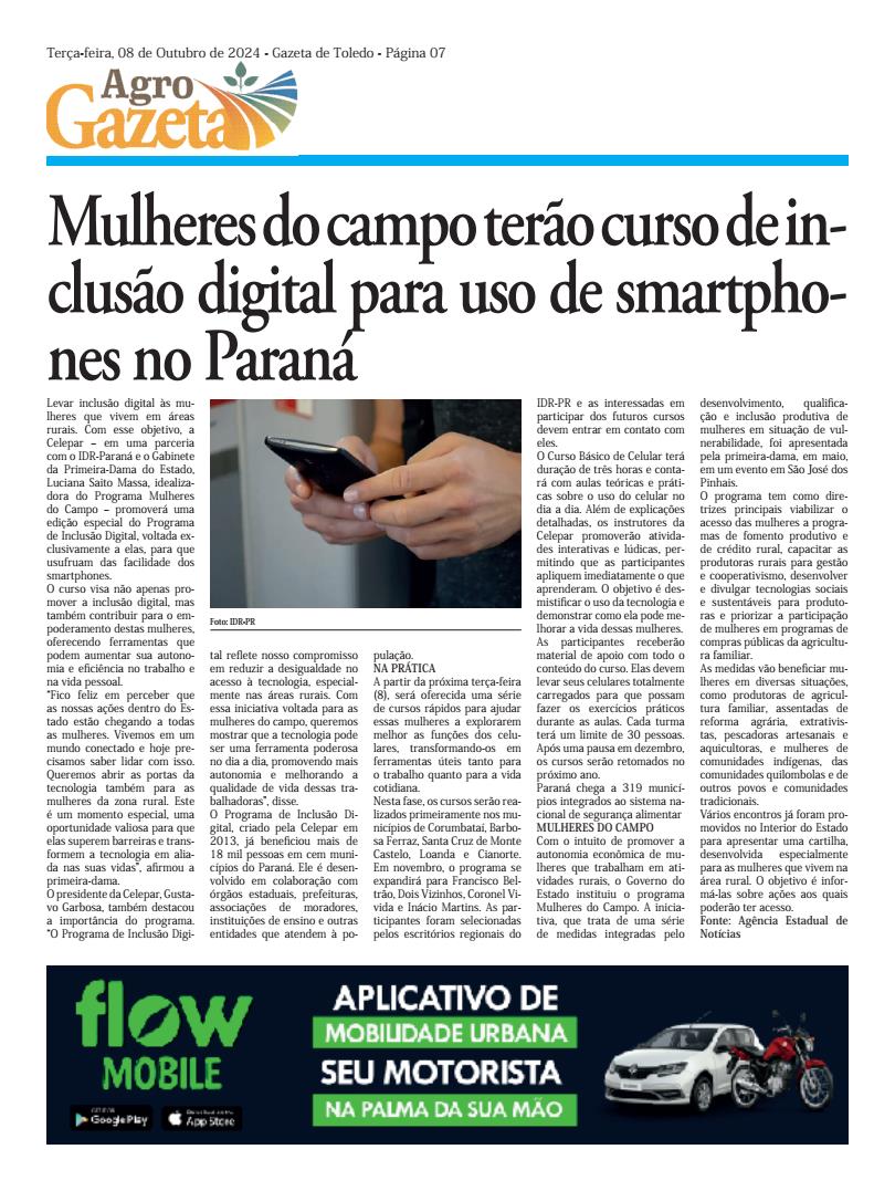 Levar inclusão digital às mulheres que vivem em áreas rurais. Com esse objetivo, a Celepar – em uma parceria com o IDR-Paraná e o Gabinete da Primeira-Dama do Estado, Luciana Saito Massa, idealizadora do Programa Mulheres do Campo – promoverá uma edição especial do Programa de Inclusão Digital, voltada exclusivamente a elas, para que usufruam das facilidade dos smartphones. O curso visa não apenas promover a inclusão digital, mas também contribuir para o empoderamento destas mulheres, oferecendo ferramentas que podem aumentar sua autonomia e eficiência no trabalho e na vida pessoal. “Fico feliz em perceber que as nossas ações dentro do Estado estão chegando a todas as mulheres. Vivemos em um mundo conectado e hoje precisamos saber lidar com isso. Queremos abrir as portas da tecnologia também para as mulheres da zona rural. Este é um momento especial, uma oportunidade valiosa para que elas superem barreiras e transformem a tecnologia em aliada nas suas vidas”, afirmou a primeira-dama. O presidente da Celepar, Gustavo Garbosa, também destacou a importância do programa. “O Programa de Inclusão Digital reflete nosso compromisso em reduzir a desigualdade no acesso à tecnologia, especialmente nas áreas rurais. Com essa iniciativa voltada para as mulheres do campo, queremos mostrar que a tecnologia pode ser uma ferramenta poderosa no dia a dia, promovendo mais autonomia e melhorando a qualidade de vida dessas trabalhadoras”, disse. O Programa de Inclusão Digital, criado pela Celepar em 2013, já beneficiou mais de 18 mil pessoas em cem municípios do Paraná. Ele é desenvolvido em colaboração com órgãos estaduais, prefeituras, associações de moradores, instituições de ensino e outras entidades que atendem à população. NA PRÁTICA A partir da próxima terça-feira (8), será oferecida uma série de cursos rápidos para ajudar essas mulheres a explorarem melhor as funções dos celulares, transformando-os em ferramentas úteis tanto para o trabalho quanto para a vida cotidiana. Nesta fase, os cursos serão realizados primeiramente nos municípios de Corumbataí, Barbosa Ferraz, Santa Cruz de Monte Castelo, Loanda e Cianorte. Em novembro, o programa se expandirá para Francisco Beltrão, Dois Vizinhos, Coronel Vivida e Inácio Martins. As participantes foram selecionadas pelos escritórios regionais do IDR-PR e as interessadas em participar dos futuros cursos devem entrar em contato com eles. O Curso Básico de Celular terá duração de três horas e contará com aulas teóricas e práticas sobre o uso do celular no dia a dia. Além de explicações detalhadas, os instrutores da Celepar promoverão atividades interativas e lúdicas, permitindo que as participantes apliquem imediatamente o que aprenderam. O objetivo é desmistificar o uso da tecnologia e demonstrar como ela pode melhorar a vida dessas mulheres. As participantes receberão material de apoio com todo o conteúdo do curso. Elas devem levar seus celulares totalmente carregados para que possam fazer os exercícios práticos durante as aulas. Cada turma terá um limite de 30 pessoas. Após uma pausa em dezembro, os cursos serão retomados no próximo ano. Paraná chega a 319 municí- pios integrados ao sistema nacional de segurança alimentar MULHERES DO CAMPO Com o intuito de promover a autonomia econômica de mulheres que trabalham em atividades rurais, o Governo do Estado instituiu o programa Mulheres do Campo. A iniciativa, que trata de uma série de medidas integradas pelo desenvolvimento, qualifica- ção e inclusão produtiva de mulheres em situação de vulnerabilidade, foi apresentada pela primeira-dama, em maio, em um evento em São José dos Pinhais. O programa tem como diretrizes principais viabilizar o acesso das mulheres a programas de fomento produtivo e de crédito rural, capacitar as produtoras rurais para gestão e cooperativismo, desenvolver e divulgar tecnologias sociais e sustentáveis para produtoras e priorizar a participação de mulheres em programas de compras públicas da agricultura familiar. As medidas vão beneficiar mulheres em diversas situações, como produtoras de agricultura familiar, assentadas de reforma agrária, extrativistas, pescadoras artesanais e aquicultoras, e mulheres de comunidades indígenas, das comunidades quilombolas e de outros povos e comunidades tradicionais. Vários encontros já foram promovidos no Interior do Estado para apresentar uma cartilha, desenvolvida especialmente para as mulheres que vivem na área rural. O objetivo é informá-las sobre ações aos quais poderão ter acesso. Fonte: Agência Estadual de Notícias