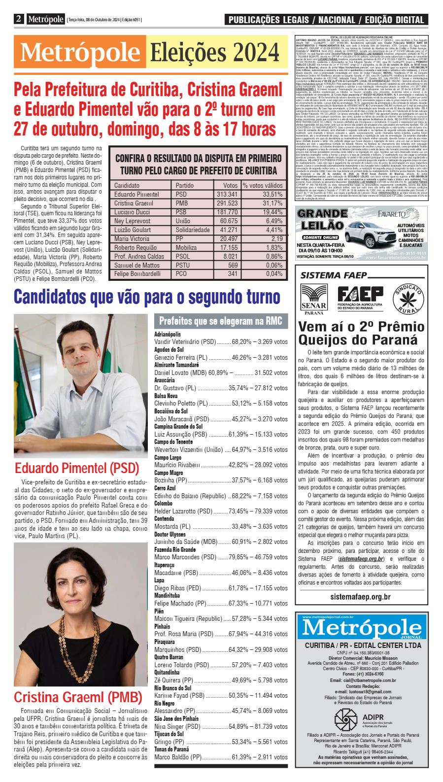 Vice-prefeito de Curitiba e ex-secretário estadual das Cidades, o neto do ex-governador e empresário da comunicação Paulo Pimentel conta com os poderosos apoios do prefeito Rafael Greca e do governador Ratinho Júnior, que também são de seu partido, o PSD. Formado em Administração, tem 39 anos de idade e tem ao seu lado na chapa, como vice, Paulo Martins (PL).