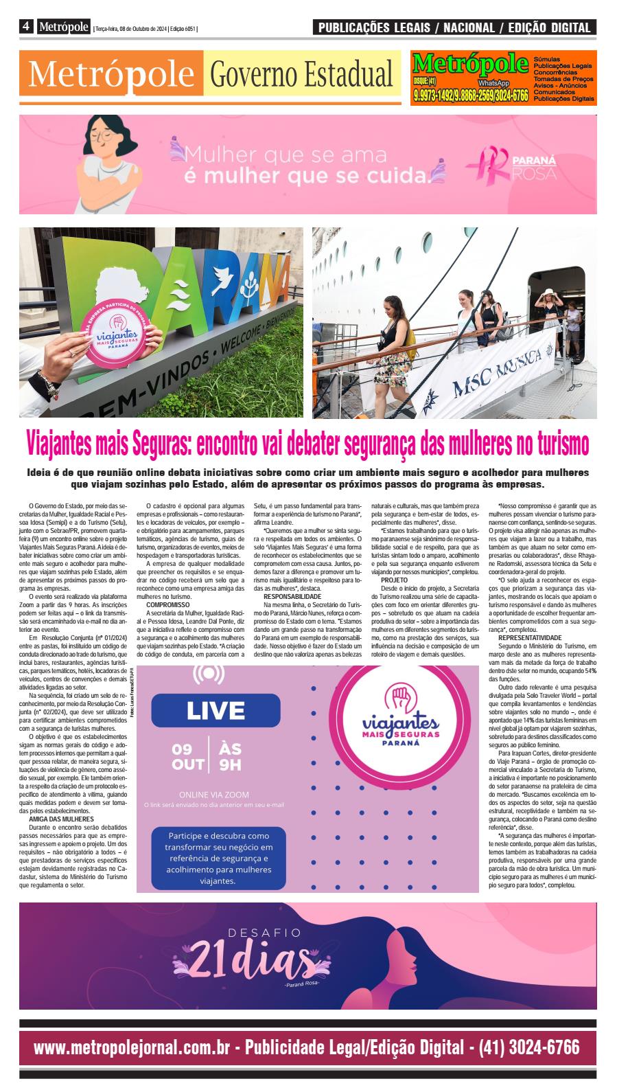 O Governo do Estado, por meio das secretarias da Mulher, Igualdade Racial e Pessoa Idosa (Semipi) e a do Turismo (Setu), junto com o Sebrae/PR, promovem quartafeira (9) um encontro online sobre o projeto Viajantes Mais Seguras Paraná. A ideia é debater iniciativas sobre como criar um ambiente mais seguro e acolhedor para mulheres que viajam sozinhas pelo Estado, além de apresentar os próximos passos do programa às empresas. O evento será realizado via plataforma Zoom a partir das 9 horas. As inscrições podem ser feitas aqui – o link da transmissão será encaminhado via e-mail no dia anterior ao evento. Em Resolução Conjunta (nº 01/2024) entre as pastas, foi instituído um código de conduta direcionado ao trade do turismo, que inclui bares, restaurantes, agências turísticas, parques temáticos, hotéis, locadoras de veículos, centros de convenções e demais atividades ligadas ao setor. Na sequência, foi criado um selo de reconhecimento, por meio da Resolução Conjunta (n° 02/2024), que deve ser utilizado para certificar ambientes comprometidos com a segurança de turistas mulheres. O objetivo é que os estabelecimentos sigam as normas gerais do código e adotem processos internos que permitam a qualquer pessoa relatar, de maneira segura, situações de violência de gênero, como assé- dio sexual, por exemplo. Ele também orienta a respeito da criação de um protocolo específico de atendimento à vítima, guiando quais medidas podem e devem ser tomadas pelos estabelecimentos. AMIGA DAS MULHERES Durante o encontro serão debatidos passos necessários para que as empresas ingressem e apoiem o projeto. Um dos requisitos – não obrigatório a todos – é que prestadoras de serviços específicos estejam devidamente registradas no Cadastur, sistema do Ministério do Turismo que regulamenta o setor. O cadastro é opcional para algumas empresas e profissionais – como restaurantes e locadoras de veículos, por exemplo – e obrigatório para acampamentos, parques temáticos, agências de turismo, guias de turismo, organizadoras de eventos, meios de hospedagem e transportadoras turísticas. A empresa de qualquer modalidade que preencher os requisitos e se enquadrar no código receberá um selo que a reconhece como uma empresa amiga das mulheres no turismo. COMPROMISSO A secretária da Mulher, Igualdade Racial e Pessoa Idosa, Leandre Dal Ponte, diz que a iniciativa reflete o compromisso com a segurança e o acolhimento das mulheres que viajam sozinhas pelo Estado. “A criação do código de conduta, em parceria com a Setu, é um passo fundamental para transformar a experiência de turismo no Paraná”, afirma Leandre. “Queremos que a mulher se sinta segura e respeitada em todos os ambientes. O selo ‘Viajantes Mais Seguras’ é uma forma de reconhecer os estabelecimentos que se comprometem com essa causa. Juntos, podemos fazer a diferença e promover um turismo mais igualitário e respeitoso para todas as mulheres”, destaca. RESPONSABILIDADE Na mesma linha, o Secretário do Turismo do Paraná, Márcio Nunes, reforça o compromisso do Estado com o tema. "Estamos dando um grande passo na transformação do Paraná em um exemplo de responsabilidade. Nosso objetivo é fazer do Estado um destino que não valoriza apenas as belezas naturais e culturais, mas que também preza pela segurança e bem-estar de todos, especialmente das mulheres”, disse. “Estamos trabalhando para que o turismo paranaense seja sinônimo de responsabilidade social e de respeito, para que as turistas sintam todo o amparo, acolhimento e pela sua segurança enquanto estiverem viajando por nossos municípios”, completou. PROJETO Desde o início do projeto, a Secretaria do Turismo realizou uma série de capacita- ções com foco em orientar diferentes grupos – sobretudo os que atuam na cadeia produtiva do setor – sobre a importância das mulheres em diferentes segmentos do turismo, como na prestação dos serviços, sua influência na decisão e composição de um roteiro de viagem e demais questões. “Nosso compromisso é garantir que as mulheres possam vivenciar o turismo paranaense com confiança, sentindo-se seguras. O projeto visa atingir não apenas as mulheres que viajam a lazer ou a trabalho, mas também as que atuam no setor como empresarias ou colaboradoras”, disse Rhayane Radomski, assessora técnica da Setu e coordenadora-geral do projeto. “O selo ajuda a reconhecer os espa- ços que priorizam a segurança das viajantes, mostrando os locais que apoiam o turismo responsável e dando às mulheres a oportunidade de escolher frequentar ambientes comprometidos com a sua segurança”, completou. REPRESENTATIVIDADE Segundo o Ministério do Turismo, em março deste ano as mulheres representavam mais da metade da força de trabalho dentro dste setor no mundo, ocupando 54% das funções. Outro dado relevante é uma pesquisa divulgada pela Solo Traveler World – portal que compila levantamentos e tendências sobre viajantes solo no mundo –, onde é apontado que 14% das turistas femininas em nível global já optam por viajarem sozinhas, sobretudo para destinos classificados como seguros ao público feminino. Para Irapuan Cortes, diretor-presidente do Viaje Paraná – órgão de promoção comercial vinculado a Secretaria do Turismo, a iniciativa é importante no posicionamento do setor paranaense na prateleira de cima do mercado. “Buscamos excelência em todos os aspectos do setor, seja na questão estrutural, receptividade e também na segurança, colocando o Paraná como destino referência”, disse. “A segurança das mulheres é importante neste contexto, porque além das turistas, temos também as trabalhadoras na cadeia produtiva, responsáveis por uma grande parcela da mão de obra turística. Um município seguro para as mulheres é um municí- pio seguro para todos”, completou.