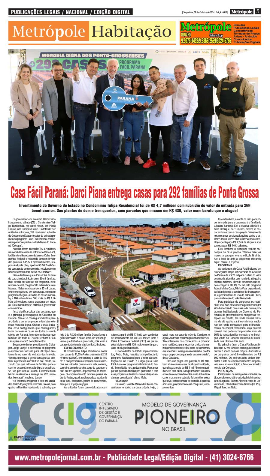 O governador em exercício Darci Piana inaugurou no sábado (05) o Condomínio Tulipa Residencial, no bairro Neves, em Ponta Grossa, nos Campos Gerais. Do total de 292 unidades entregues, 269 receberam subsídio do Governo do Estado no valor de entrada por meio do programa Casa Fácil Paraná, coordenado pela Companhia de Habitação do Paraná (Cohapar). Ao todo, foram investidos R$ 4,7 milhões na modalidade valor de entrada do Casa Fácil, facilitando o financiamento junto a Caixa Econômica Federal e reduzindo também o valor das parcelas. A PRM Empreendimentos, responsável pela obra, aportou R$ 50,7 milhões na construção do condomínio, resultando em um investimento total de R$ 55,4 milhões. Piana destacou que o Casa Fácil foi criado para atender, inicialmente, 30 mil famílias, mas devido ao sucesso do programa, esse número deverá chegar a 100 mil unidades entregues. “Estamos chegando a 80 mil casas, entre entregues ou em construção, e o nosso programa chegará, até o fim do nosso mandato, a 100 mil unidades. São mais de R$ 1 bilhão já investidos nesse programa em todas as suas modalidades”, afirmou o governador em exercício. “Isso significa cuidar das pessoas, que é a principal preocupação do Governo do Paraná. Não é só conseguir indústria para a cidade e gerar emprego, é também oferecer moradia digna. Graças a esse trabalho, essa configuração que conseguimos fazer para essas casas em todos os municípios do Paraná, tem oportunizando que famílias de todo o Estado tenham a sua casa para morar”, complementou. Segundo o diretor-presidente da Cohapar, Jorge Lange, o diferencial do programa é oferecer um subsídio para utilização diretamente no valor de entrada dos imóveis. “Isso fez com que a gente conseguisse acelerar o processo construtivo do Estado, fazendo com que milhares de famílias pudessem ter acesso à moradia digna e espalhasse isso por todo o Paraná. Estamos muito felizes realizando a entrega de 292 unidades hoje aqui”, explicou Lange. “Já estamos chegando a sete mil unidades dentro do programa em Ponta Grossa, com quatro mil famílias recebendo o subsídio, quehoje é de R$ 20 mil por família. Dessa forma a gente consolida o nosso lema, de ser um governo que trabalha e que cuida, pois levar a casa própria é cuidar das famílias”, finalizou. EMPREENDIMENTO O Condomínio Tulipa Residencial conta com casas de 41,55 m² (dois quartos) e 62,32 m² (três quartos), em terrenos a partir de 150 m², o que possibilita a expansão das residências. As unidades contam com sala, cozinha, banheiro, área de serviço, vaga de garagem e dois ou três quartos, dependendo da metragem. O empreendimento também possui salão de festas, quadra poliesportiva, academia ao ar livre, parquinho, jardim de convivência, área pet e espaço de jogos. As unidades foram comercializadas com valores a partir de R$ 171 mil, com condições de financiamento em até 420 meses junto à Caixa Econômica Federal (CEF). As presta- ções iniciam em R$ 430, mais em conta que o valor do aluguel na cidade. O sócio-diretor da PRM Empreendimentos, Pedro Maia, ressaltou a importância do programa habitacional para o setor da construção civil no Estado. “Eu digo que o Casa Fácil é o maior programa habitacional do Brasil. Sem dúvida nos ajudou muito. Passamos por um período difícil no pós-pandemia e sem esse programa estaríamos numa situação ainda mais complicada”, afirma Maia. VIDA NOVA Cassiano Cassol e Milene de Oliveira conquistaram o sonho da casa própria. Hoje, o casal mora na casa da mãe de Cassiano, e agora vão ter um cantinho para chamar de seu. “Recentemente nós começamos a procurar uma residência para tocarmos a vida de maneira independente e deu certo de acharmos o residencial. Conseguimos o subsídio, que foi o que proporcionou para nós essa conquista”, disse Cassiano. Eles vão pagar uma parcela de R$ 600, bem abaixo de um valor de aluguel na cidade, que chega a mais de R$ 1 mil. “Sem o subsí- dio seria bem difícil. Nós já tínhamos ido atrás em outros empreendimentos e não tinha dado certo, mas com o subsídio foi a melhor coisa que teve, porque o valor de entrada, a parcela acessível, proporcionou essa conquista”, complementou.Quem também já conta os dias para poder se mudar para a casa nova é a família do Cristiano Santana. Ele, a esposa Milena e o bebê Henrique, de 11 meses, devem se mudar em breve para a casa própria. “Atualmente nós moramos de aluguel aqui no centro e estamos muito felizes com a nossa nova casa. Hoje a gente paga R$ 1,2 mil de aluguel e aqui vamos pagar R$ 940”, salientou. Eles também já planejam realizar mudanças na casa própria. “Vamos fazer os muros, a garagem e uma edícula lá atrás. Até o final do ano já estaremos morando aqui”, contou a esposa. PROGRAMA As vantagens do Casa Fácil incluem, em sua segunda etapa, um subsídio do Governo do Paraná de R$ 20 mil para custeio do valor de entrada a famílias com renda de até quatro salários-mínimos, além de descontos que podem chegar a até R$ 55 mil pelo programa federal Minha Casa, Minha Vida, dependendo da faixa de renda e condições de financiamento, e possibilidade de uso do saldo do FGTS para abatimento do valor financiado. Para participar do programa, os requisitos são: não possuir casa própria; não ter sido beneficiado com casas de outros programas habitacionais do Governo do Paraná ou do governo federal; não possuir restrições de crédito; ter renda mensal máxima de até quatro salários-mínimos nacional; ter renda compatível para o financiamento do imóvel pretendido, cuja parcela mensal não poderá comprometer mais de 30% da renda familiar mensal; e ter inscri- ção válida na Cohapar efetuada ou atualizada nos últimos dois anos. Na primeira fase, o Casa Fácil possibilitou que 32 mil famílias conseguissem conquistar o sonho da casa própria. A nova fase do programa prevê investimentos