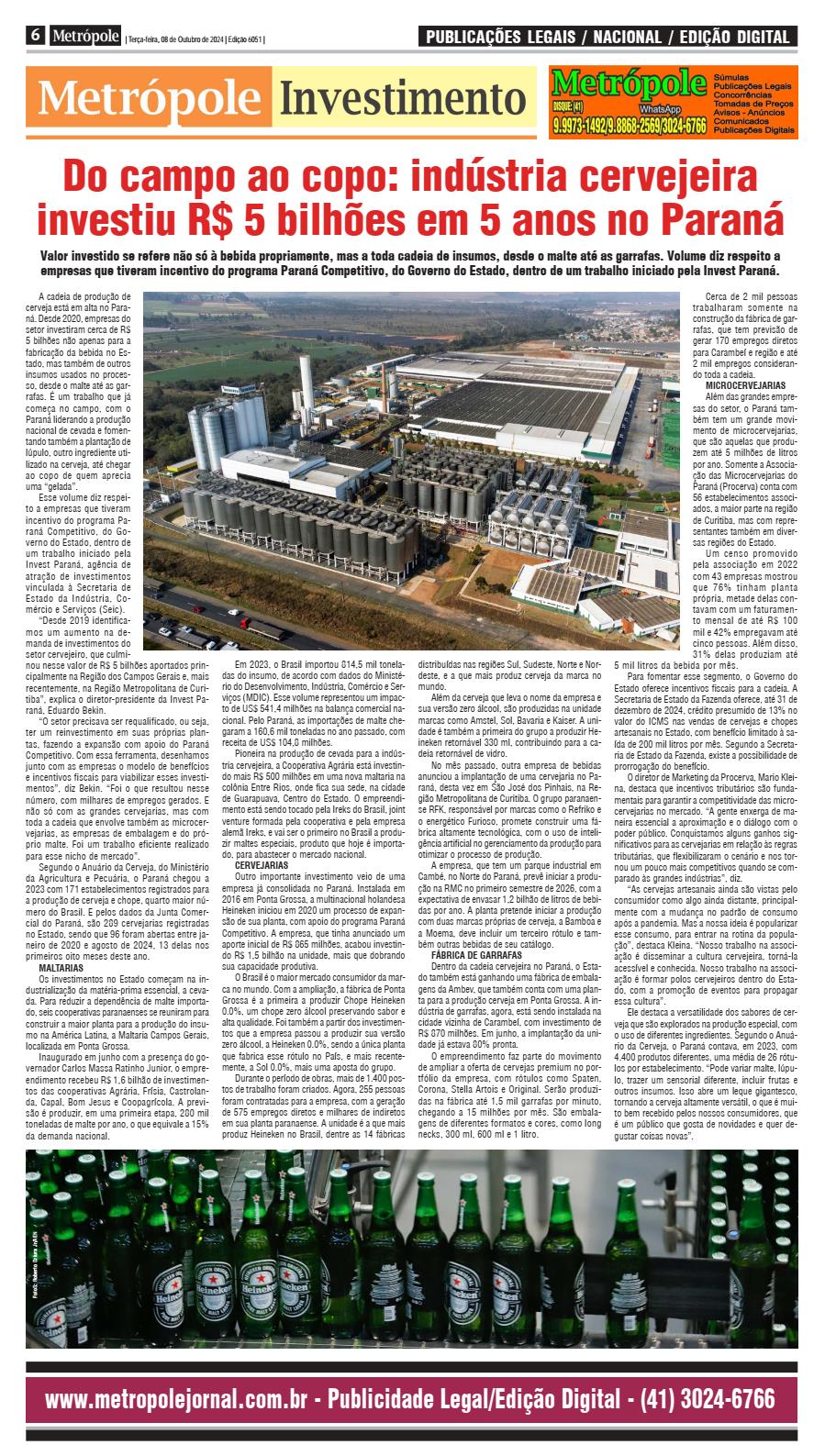 A cadeia de produção de cerveja está em alta no Paraná. Desde 2020, empresas do setor investiram cerca de R$ 5 bilhões não apenas para a fabricação da bebida no Estado, mas também de outros insumos usados no processo, desde o malte até as garrafas. É um trabalho que já começa no campo, com o Paraná liderando a produção nacional de cevada e fomentando também a plantação de lúpulo, outro ingrediente utilizado na cerveja, até chegar ao copo de quem aprecia uma “gelada”. Esse volume diz respeito a empresas que tiveram incentivo do programa Paraná Competitivo, do Governo do Estado, dentro de um trabalho iniciado pela Invest Paraná, agência de atração de investimentos vinculada à Secretaria de Estado da Indústria, Comércio e Serviços (Seic). “Desde 2019 identificamos um aumento na demanda de investimentos do setor cervejeiro, que culminou nesse valor de R$ 5 bilhões aportados principalmente na Região dos Campos Gerais e, mais recentemente, na Região Metropolitana de Curitiba”, explica o diretor-presidente da Invest Paraná, Eduardo Bekin. “O setor precisava ser requalificado, ou seja, ter um reinvestimento em suas próprias plantas, fazendo a expansão com apoio do Paraná Competitivo. Com essa ferramenta, desenhamos junto com as empresas o modelo de benefícios e incentivos fiscais para viabilizar esses investimentos”, diz Bekin. “Foi o que resultou nesse número, com milhares de empregos gerados. E não só com as grandes cervejarias, mas com toda a cadeia que envolve também as microcervejarias, as empresas de embalagem e do pró- prio malte. Foi um trabalho eficiente realizado para esse nicho de mercado”. Segundo o Anuário da Cerveja, do Ministério da Agricultura e Pecuária, o Paraná chegou a 2023 com 171 estabelecimentos registrados para a produção de cerveja e chope, quarto maior nú- mero do Brasil. E pelos dados da Junta Comercial do Paraná, são 289 cervejarias registradas no Estado, sendo que 96 foram abertas entre janeiro de 2020 e agosto de 2024, 13 delas nos primeiros oito meses deste ano. MALTARIAS Os investimentos no Estado começam na industrialização da matéria-prima essencial, a cevada. Para reduzir a dependência de malte importado, seis cooperativas paranaenses se reuniram para construir a maior planta para a produção do insumo na América Latina, a Maltaria Campos Gerais, localizada em Ponta Grossa. Inaugurado em junho com a presença do governador Carlos Massa Ratinho Junior, o empreendimento recebeu R$ 1,6 bilhão de investimentos das cooperativas Agrária, Frísia, Castrolanda, Capal, Bom Jesus e Coopagrícola. A previsão é produzir, em uma primeira etapa, 280 mil toneladas de malte por ano, o que equivale a 15% da demanda nacional.Em 2023, o Brasil importou 814,5 mil toneladas do insumo, de acordo com dados do Ministé- rio do Desenvolvimento, Indústria, Comércio e Serviços (MDIC). Esse volume representou um impacto de US$ 541,4 milhões na balança comercial nacional. Pelo Paraná, as importações de malte chegaram a 160,6 mil toneladas no ano passado, com receita de US$ 104,8 milhões. Pioneira na produção de cevada para a indústria cervejeira, a Cooperativa Agrária está investindo mais R$ 500 milhões em uma nova maltaria na colônia Entre Rios, onde fica sua sede, na cidade de Guarapuava, Centro do Estado. O empreendimento está sendo tocado pela Ireks do Brasil, joint venture formada pela cooperativa e pela empresa alemã Ireks, e vai ser o primeiro no Brasil a produzir maltes especiais, produto que hoje é importado, para abastecer o mercado nacional. CERVEJARIAS Outro importante investimento veio de uma empresa já consolidada no Paraná. Instalada em 2016 em Ponta Grossa, a multinacional holandesa Heineken iniciou em 2020 um processo de expansão de sua planta, com apoio do programa Paraná Competitivo. A empresa, que tinha anunciado um aporte inicial de R$ 865 milhões, acabou investindo R$ 1,5 bilhão na unidade, mais que dobrando sua capacidade produtiva. O Brasil é o maior mercado consumidor da marca no mundo. Com a ampliação, a fábrica de Ponta Grossa é a primeira a produzir Chope Heineken 0.0%, um chope zero álcool preservando sabor e alta qualidade. Foi também a partir dos investimentos que a empresa passou a produzir sua versão zero álcool, a Heineken 0.0%, sendo a única planta que fabrica esse rótulo no País, e mais recentemente, a Sol 0.0%, mais uma aposta do grupo. Durante o período de obras, mais de 1.400 postos de trabalho foram criados. Agora, 255 pessoas foram contratadas para a empresa, com a geração de 575 empregos diretos e milhares de indiretos em sua planta paranaense. A unidade é a que mais produz Heineken no Brasil, dentre as 14 fábricas distribuídas nas regiões Sul, Sudeste, Norte e Nordeste, e a que mais produz cerveja da marca no mundo. Além da cerveja que leva o nome da empresa e sua versão zero álcool, são produzidas na unidade marcas como Amstel, Sol, Bavaria e Kaiser. A unidade é também a primeira do grupo a produzir Heineken retornável 330 ml, contribuindo para a cadeia retornável de vidro. No mês passado, outra empresa de bebidas anunciou a implantação de uma cervejaria no Paraná, desta vez em São José dos Pinhais, na Região Metropolitana de Curitiba. O grupo paranaense RFK, responsável por marcas como o Refriko e o energético Furioso, promete construir uma fá- brica altamente tecnológica, com o uso de inteligência artificial no gerenciamento da produção para otimizar o processo de produção. A empresa, que tem um parque industrial em Cambé, no Norte do Paraná, prevê iniciar a produ- ção na RMC no primeiro semestre de 2026, com a expectativa de envasar 1,2 bilhão de litros de bebidas por ano. A planta pretende iniciar a produção com duas marcas próprias de cerveja, a Bamboa e a Moema, deve incluir um terceiro rótulo e também outras bebidas de seu catálogo. FÁBRICA DE GARRAFAS Dentro da cadeia cervejeira no