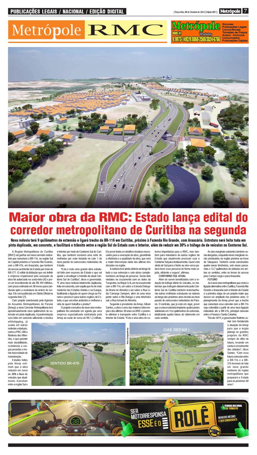 A Região Metropolitana de Curitiba (RMC) vai ganhar um novo corredor rodovi- ário que conectará a BR-116, na região Sul da Capital próximo à Fazenda Rio Grande, com a BR-476, em Araucária, que também dá acesso ao Interior do Estado por meio da BR-277. O edital da licitação que vai definir a empresa responsável pela execução da obra foi autorizado na sexta-feira (4) e prevê um investimento de até R$ 394 milhões, com prazo estimado em 30 meses para conclusão após a assinatura da ordem de serviço. Ele será publicado em Diário Oficial na segunda-feira (7). Com projeto coordenado pela Agência de Assuntos Metropolitanos do Paraná (Amep), o novo Corredor Metropolitano terá aproximadamente nove quilômetros de extensão em pista duplicada. A pavimentação será feita em concreto utilizando a técnica whitetopping, já usada em outras rodovias estaduais, como a PRC-280 a Rodovia dos Miné- rios, e que garante mais durabilidade, resistência a cargas pesadas e menor necessidade de manutenção. Estudos feitos pela Amep estimam que a obra reduzirá em cerca de 30% o fluxo de veículos que atualmente transitam entre a região Sul e o Interior por meio do Contorno Sul de Curitiba, que também receberá uma série de melhorias por estar incluído no Lote 1 do novo pacote de concessões rodoviárias do Estado. “Esta é mais uma grande obra estrutural feita com recursos do Estado e que vai ajudar a desafogar o trânsito do atual Contorno Sul de Curitiba”, disse o governador. “É uma nova rodovia totalmente duplicada, feita em concreto, com aquilo que há de mais moderno nos Estados Unidos e na Europa, facilitando a ligação de quem chega ao Paraná e precisa ir para outras regiões do Estado, o que vai evitar acidentes e melhorar a vida de quem trabalha e produz”. O projeto executivo do novo eixo metropolitano foi concluído em agosto por uma empresa especializada contratada pela Amep ao custo de cerca de R$ 1,3 milhão. Ele prevê todos os detalhes técnicos necessários para a execução da obra, garantindo a eficiência e a qualidade da obra, que será a maior intervenção viária das últimas três décadas na região. A rodovia terá ainda ciclovia ao longo de toda a sua extensão e sete obras complementares ao longo do percurso. Serão dois viadutos no cruzamento com os dutos da Traspretro, na Repar I e II, um no cruzamento com a BR-116, um sobre a Estrada Delegado Bruno de Almeida e um sobre a Rua Lí- dia Camargo Zampieri, além de uma nova ponte sobre o Rio Barigui e uma trincheira sob a Rua Ismael de Almeida. Segundo o presidente da Amep, Gilson Santos, a obra é uma das maiores interven- ções dos últimos 30 anos na RMC e promete otimizar o transporte entre Curitiba e o Interior do Estado. “Esta é uma obra de extrema importância para a RMC, mas também para moradores de outras regiões do Estado que atualmente precisam usar o Contorno Sul para deslocamento. Quem está vindo do Sul para o Norte ou vice-versa poderá fazer esse percurso de forma mais rá- pida, eficiente e segura”, afirmou. CONTORNO SUL ATUAL Além de serem beneficiados com a redução do tráfego diário de veículos, os motoristas que trafegam diariamente pelo Contorno Sul de Curitiba também testemunharão outras melhorias estruturais na rodovia ao longo dos próximos anos devido ao novo pacote de concessões rodoviárias do Paraná. O contrato, que já está em vigor, prevê que a concessionária implante quatro pistas adicionais em 14,6 quilômetros de extensão, totalizando quatro faixas de rolamento em cada sentido. As vias marginais existentes também serão alargadas, enquanto novas marginais serão construídas na região próxima ao trevo do Tatuquara. Também serão construídas quatro novas trincheiras, seis novas passarelas e 13,7 quilômetros de ciclovias em ambos os sentidos, entre os trevos de acesso para Campo Largo e para Araucária. FUTURO Já o novo eixo metropolitano que criará a ligação alternativa entre Curitiba, Fazenda Rio Grande e Araucária com o Interior do Estado é a primeira etapa de um projeto maior que deverá ser ampliado nos próximos anos. O planejamento da Amep prevê que o trecho que conectará esse corredor com a BR-116 seja estendido a partir de uma nova ligação rodoviária até a BR-376, principal conexão entre o Paraná e Santa Catarina. “Desde 2019, o governador Ratinho Junior tem fortalecido a atuação da Amep para que o órgão planeje os grandes projetos da RMC sempre de olho no futuro, levando em conta o crescimento das cidades”, disse Santos. “Com essa futura conexão entre a BR-116 e a BR- 376 teremos de fato um novo grande contorno da região metropolitana que preparará o Estado para os próximos 50 anos”.