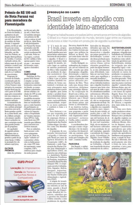 É de Florestópolis, no Norte do Estado, a ganhadora do prêmio principal, de R$ 100 mil, do sorteio de outubro do Nota Paraná. O segundo prêmio, de R$ 50 mil, foi para um consumidor do bairro São Sebastião, em São José dos Pinhais, na Região Metropolitana de Curitiba. O sorteio, realizado ontem, distribuiu mais de 35 mil prêmios e contou com um número recorde de participantes, com mais de 3,17 milhões de concorrentes. Programa do Governo do Estado, coordenado pela Secretaria da Fazenda, o Nota Paraná é uma iniciativa de conscientização fiscal que devolve parte do ICMS pago pelo consumidor em suas compras no comércio e promove sorteios mensais. A consumidora de Florestópolis que faturou o prêmio principal concorreu com 29 bilhetes gerados a partir de 14 notas fiscais, sendo o bilhete sorteado o de número 132080. Essa é a primeira vez que o município recebe uma grande premiação do programa. Já o ganhador do segundo prêmio participou com 14 bilhetes eletrônicos, gerados a partir de 39 notas fiscais. O bilhete premiado foi o de número 24975104. OUTROS PRÊMIOS Além dos prêmios de R$ 100 mil e R$ 50 mil, o Nota Paraná também entregou 100 prêmios de R$ 1.000 e outros 35 mil de R$ 50. Além disso, 8 mil participantes do Paraná Pay foram premiados com R$ 100, e 40 entidades sociais receberam R$ 5 mil cada. Pelas novas regras, o sorteio de R$ 1 milhão é feito apenas quatro vezes ao ano — nos meses de fevereiro, maio, agosto e dezembro. COMO PARTICIPAR Participar do Programa Nota Paraná é simples: ao fazer compras nos estabelecimentos comerciais do Estado, os consumidores cadastrados devem solicitar a inclusão do CPF na nota fiscal. Essa prática possibilita acumular créditos, os quais podem ser transferidos para a conta bancária do participante ou utilizados para abater valores do Imposto sobre a Propriedade de Veículos Automotores (IPVA). Cada nota fiscal com CPF inserido gera bilhetes para concorrer nos sorteios mensais. Para se cadastrar, basta acessar o site www.notaparana. pr.gov.br, clicar na opção “cadastre-se” e preencher a ficha com os dados pessoais, como CPF, data de nascimento, nome completo, CEP e endereço para criação da senha pessoal.