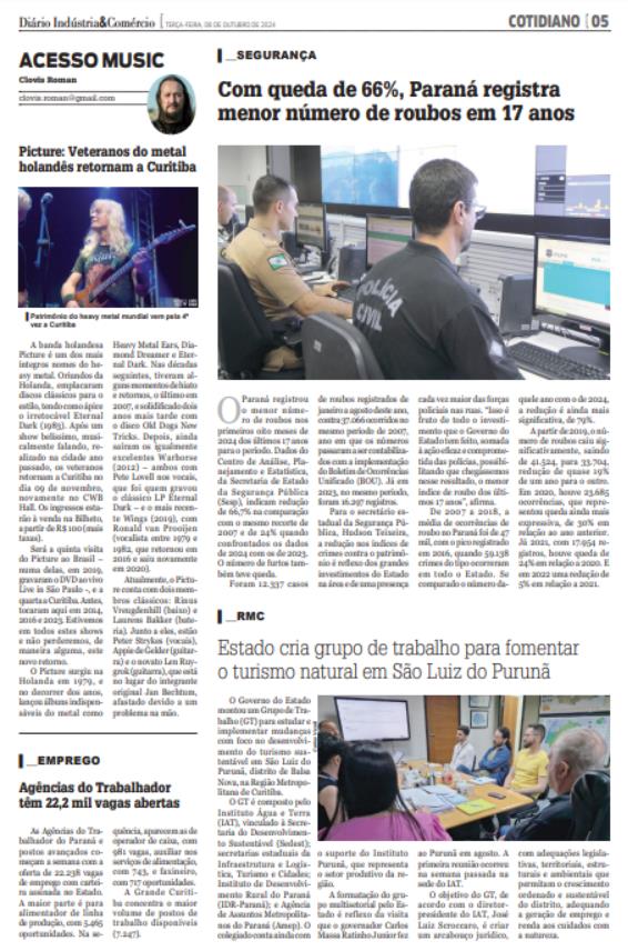 O Paraná registrou o menor número de roubos nos primeiros oito meses de 2024 dos últimos 17 anos para o período. Dados do Centro de Análise, Planejamento e Estatística, da Secretaria de Estado da Segurança Pública (Sesp), indicam redução de 66,7% na comparação com o mesmo recorte de 2007 e de 24% quando confrontados os dados de 2024 com os de 2023. O número de furtos também teve queda. Foram 12.337 casos de roubos registrados de janeiro a agosto deste ano, contra 37.066 ocorridos no mesmo período de 2007, ano em que os números passaram a ser contabilizados com a implementação do Boletim de Ocorrências Unificado (BOU). Já em 2023, no mesmo período, foram 16.297 registros. Para o secretário estadual da Segurança Pública, Hudson Teixeira, a redução nos índices de crimes contra o patrimônio é reflexo dos grandes investimentos do Estado na área e de uma presença cada vez maior das forças policiais nas ruas. “Isso é fruto de todo o investimento que o Governo do Estado tem feito, somada à ação eficaz e comprometida das polícias, possibilitando que chegássemos nesse resultado, o menor índice de roubo dos últimos 17 anos”, afirma. De 2007 a 2018, a média de ocorrências de roubo no Paraná foi de 47 mil, com o pico registrado em 2016, quando 59.138 crimes do tipo ocorreram em todo o Estado. Se comparado o número daquele ano com o de 2024, a redução é ainda mais significativa, de 79%. A partir de 2019, o número de roubos caiu significativamente, saindo de 41.524, para 33.704, redução de quase 19% de um ano para o outro. Em 2020, houve 23.685 ocorrências, que representou queda ainda mais expressiva, de 30% em relação ao ano anterior. Já 2021, com 17.954 registros, houve queda de 24% em relação a 2020. E em 2022 uma redução de 5% em relação a 2021.