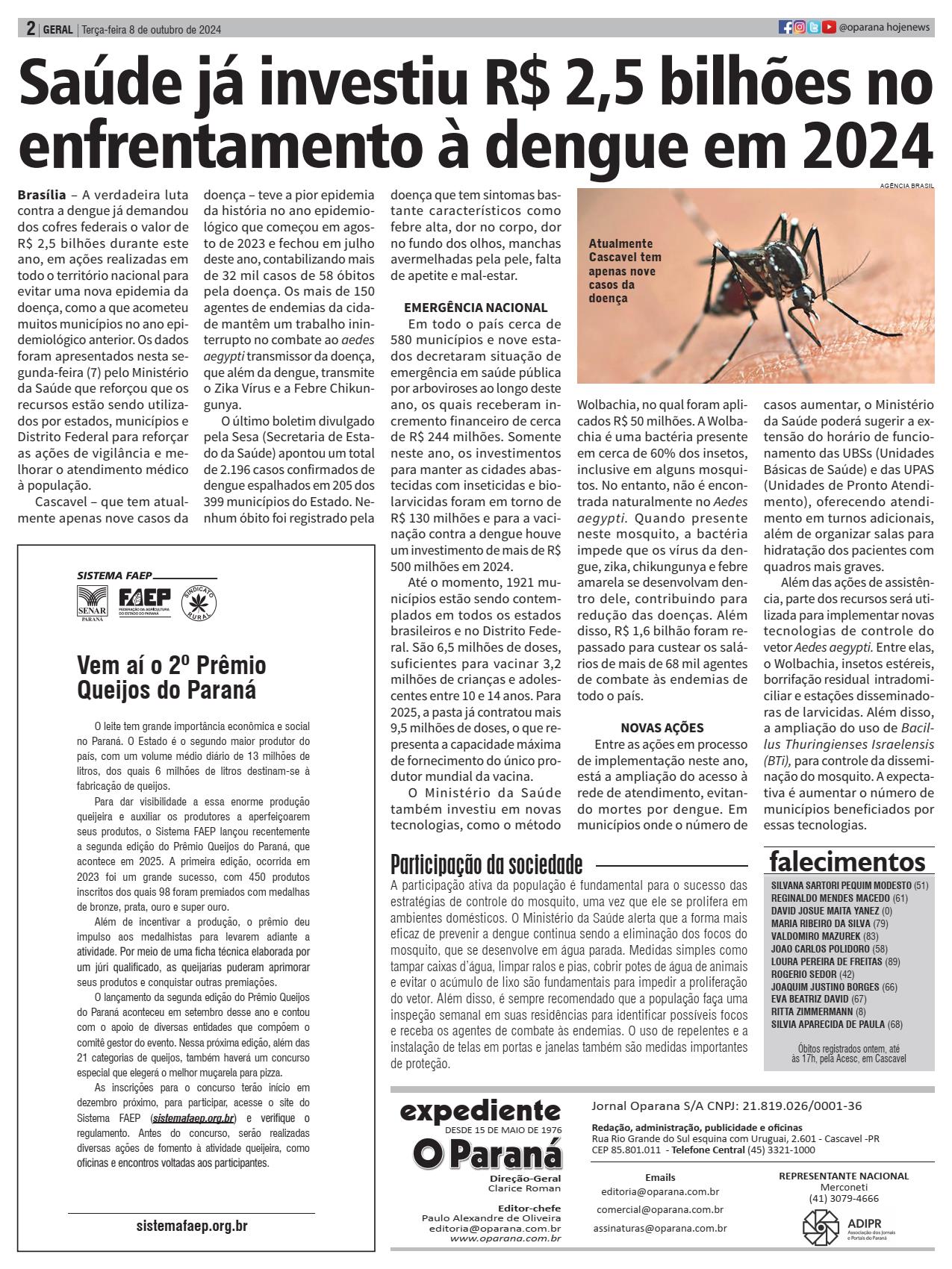 Brasília – A verdadeira luta contra a dengue já demandou dos cofres federais o valor de R$ 2,5 bilhões durante este ano, em ações realizadas em todo o território nacional para evitar uma nova epidemia da doença, como a que acometeu muitos municípios no ano epidemiológico anterior. Os dados foram apresentados nesta segunda-feira (7) pelo Ministério da Saúde que reforçou que os recursos estão sendo utilizados por estados, municípios e Distrito Federal para reforçar as ações de vigilância e melhorar o atendimento médico à população. Cascavel – que tem atualmente apenas nove casos da doença – teve a pior epidemia da história no ano epidemiológico que começou em agosto de 2023 e fechou em julho deste ano, contabilizando mais de 32 mil casos de 58 óbitos pela doença. Os mais de 150 agentes de endemias da cidade mantêm um trabalho ininterrupto no combate ao aedes aegypti transmissor da doença, que além da dengue, transmite o Zika Vírus e a Febre Chikungunya. O último boletim divulgado pela Sesa (Secretaria de Estado da Saúde) apontou um total de 2.196 casos confirmados de dengue espalhados em 205 dos 399 municípios do Estado. Nenhum óbito foi registrado peladoença que tem sintomas bastante característicos como febre alta, dor no corpo, dor no fundo dos olhos, manchas avermelhadas pela pele, falta de apetite e mal-estar. EMERGÊNCIA NACIONAL Em todo o país cerca de 580 municípios e nove estados decretaram situação de emergência em saúde pública por arboviroses ao longo deste ano, os quais receberam incremento financeiro de cerca de R$ 244 milhões. Somente neste ano, os investimentos para manter as cidades abastecidas com inseticidas e biolarvicidas foram em torno de R$ 130 milhões e para a vacinação contra a dengue houve um investimento de mais de R$ 500 milhões em 2024. Até o momento, 1921 municípios estão sendo contemplados em todos os estados brasileiros e no Distrito Federal. São 6,5 milhões de doses, suficientes para vacinar 3,2 milhões de crianças e adolescentes entre 10 e 14 anos. Para 2025, a pasta já contratou mais 9,5 milhões de doses, o que representa a capacidade máxima de fornecimento do único produtor mundial da vacina. O Ministério da Saúde também investiu em novas tecnologias, como o método Wolbachia, no qual foram aplicados R$ 50 milhões. A Wolbachia é uma bactéria presente em cerca de 60% dos insetos, inclusive em alguns mosquitos. No entanto, não é encontrada naturalmente no Aedes aegypti. Quando presente neste mosquito, a bactéria impede que os vírus da dengue, zika, chikungunya e febre amarela se desenvolvam dentro dele, contribuindo para redução das doenças. Além disso, R$ 1,6 bilhão foram repassado para custear os salá- rios de mais de 68 mil agentes de combate às endemias de todo o país. NOVAS AÇÕES Entre as ações em processo de implementação neste ano, está a ampliação do acesso à rede de atendimento, evitando mortes por dengue. Em municípios onde o número de casos aumentar, o Ministério da Saúde poderá sugerir a extensão do horário de funcionamento das UBSs (Unidades Básicas de Saúde) e das UPAS (Unidades de Pronto Atendimento), oferecendo atendimento em turnos adicionais, além de organizar salas para hidratação dos pacientes com quadros mais graves. Além das ações de assistência, parte dos recursos será utilizada para implementar novas tecnologias de controle do vetor Aedes aegypti. Entre elas, o Wolbachia, insetos estéreis, borrifação residual intradomiciliar e estações disseminadoras de larvicidas. Além disso, a ampliação do uso de Bacillus Thuringienses Israelensis (BTi), para controle da disseminação do mosquito. A expectativa é aumentar o número de municípios beneficiados por essas tecnologias.