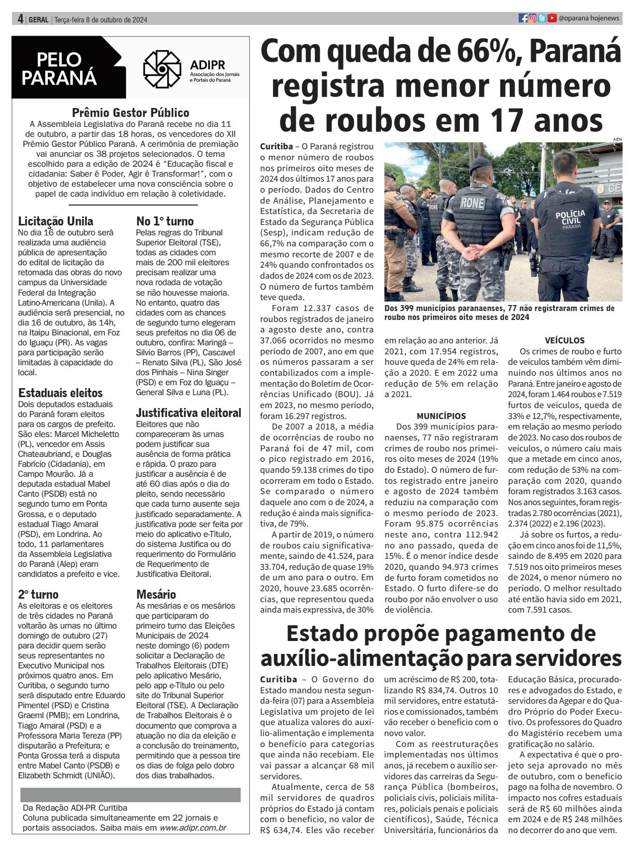 Curitiba – O Governo do Estado mandou nesta segunda-feira (07) para a Assembleia Legislativa um projeto de lei que atualiza valores do auxí- lio-alimentação e implementa o benefício para categorias que ainda não recebiam. Ele vai passar a alcançar 68 mil servidores. Atualmente, cerca de 58 mil servidores de quadros próprios do Estado já contam com o benefício, no valor de R$ 634,74. Eles vão receber um acréscimo de R$ 200, totalizando R$ 834,74. Outros 10 mil servidores, entre estatutá- rios e comissionados, também vão receber o benefício com o novo valor. Com as reestruturações implementadas nos últimos anos, já recebem o auxílio servidores das carreiras da Segurança Pública (bombeiros, policiais civis, policiais militares, policiais penais e policiais científicos), Saúde, Técnica Universitária, funcionários da Educação Básica, procuradores e advogados do Estado, e servidores da Agepar e do Quadro Próprio do Poder Executivo. Os professores do Quadro do Magistério recebem uma gratificação no salário. A expectativa é que o projeto seja aprovado no mês de outubro, com o benefício pago na folha de novembro. O impacto nos cofres estaduais será de R$ 60 milhões ainda em 2024 e de R$ 248 milhões no decorrer do ano que vem.