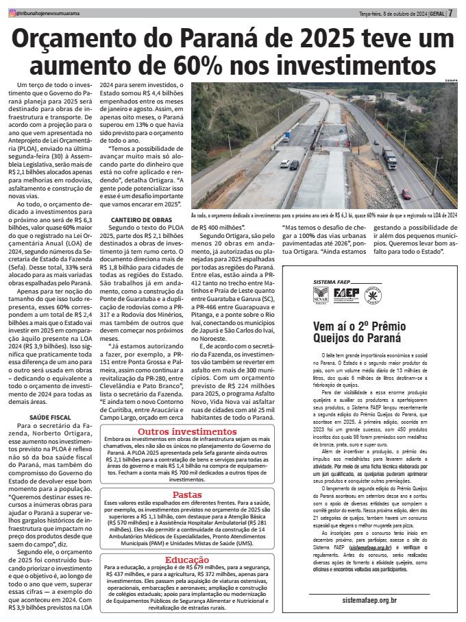 m terço de todo o investimento que o Governo do Paraná planeja para 2025 será destinado para obras de infraestrutura e transporte. De acordo com a projeção para o ano que vem apresentada no Anteprojeto de Lei Orçamentá- ria (PLOA), enviado na última segunda-feira (30) à Assembleia Legislativa, serão mais de R$ 2,1 bilhões alocados apenas para melhorias em rodovias, asfaltamento e construção de novas vias. Ao todo, o orçamento dedicado a investimentos para o próximo ano será de R$ 6,3 bilhões, valor quase 60% maior do que o registrado na Lei Or- çamentária Anual (LOA) de 2024, segundo números da Secretaria de Estado da Fazenda (Sefa). Desse total, 33% será alocado para as mais variadas obras espalhadas pelo Paraná. Apenas para ter noção do tamanho do que isso tudo representa, esses 60% correspondem a um total de R$ 2,4 bilhões a mais que o Estado vai investir em 2025 em compara- ção àquilo presente na LOA 2024 (R$ 3,9 bilhões). Isso significa que praticamente toda essa diferença de um ano para o outro será usada em obras – dedicando o equivalente a todo o orçamento de investimento de 2024 para todas as demais áreas. SAÚDE FISCAL Para o secretário da Fazenda, Norberto Ortigara, esse aumento nos investimentos previsto na PLOA é reflexo não só da boa saúde fiscal do Paraná, mas também do compromisso do Governo do Estado de devolver esse bom momento para a população. “Queremos destinar esses recursos a inúmeras obras para ajudar o Paraná a superar velhos gargalos históricos de infraestrutura que impactam no preço dos produtos desde que saem do campo”, diz. Segundo ele, o orçamento de 2025 foi construído buscando priorizar o investimento e que o objetivo é, ao longo de todo o ano que vem, superar essas cifras — a exemplo do que aconteceu em 2024. Com R$ 3,9 bilhões previstos na LOA 2024 para serem investidos, o Estado somou R$ 4,4 bilhões empenhados entre os meses de janeiro e agosto. Assim, em apenas oito meses, o Paraná superou em 13% o que havia sido previsto para o orçamento de todo o ano. “Temos a possibilidade de avançar muito mais só alocando parte do dinheiro que está no cofre aplicado e rendendo”, detalha Ortigara. “A gente pode potencializar isso e esse é um desafio importante que vamos encarar em 2025”. CANTEIRO DE OBRAS Segundo o texto do PLOA 2025, parte dos R$ 2,1 bilhões destinados a obras de investimento já tem rumo certo. O documento direciona mais de R$ 1,8 bilhão para cidades de todas as regiões do Estado. São trabalhos já em andamento, como a construção da Ponte de Guaratuba e a duplicação de rodovias como a PR- 317 e a Rodovia dos Minérios, mas também de outros que devem começar nos próximos meses. “Já estamos autorizando a fazer, por exemplo, a PR- 151 entre Ponta Grossa e Palmeira, assim como continuar a revitalização da PR-280, entre Clevelândia e Pato Branco”, lista o secretário da Fazenda. “E ainda tem o novo Contorno de Curitiba, entre Araucária e Campo Largo, orçado em cerca de R$ 400 milhões”. Segundo Ortigara, são pelo menos 20 obras em andamento, já autorizadas ou planejadas para 2025 espalhadas por todas as regiões do Paraná. Entre elas, estão ainda a PR- 412 tanto no trecho entre Matinhos e Praia de Leste quanto entre Guaratuba e Garuva (SC), a PR-466 entre Guarapuava e Pitanga, e a ponte sobre o Rio Ivaí, conectando os municípios de Japurá e São Carlos do Ivaí, no Noroeste. E, de acordo com o secretá- rio da Fazenda, os investimentos vão também se reverter em asfalto em mais de 300 municípios. Com um orçamento previsto de R$ 224 milhões para 2025, o programa Asfalto Novo, Vida Nova vai asfaltar ruas de cidades com até 25 mil habitantes de todo o Paraná.“Mas temos o desafio de chegar a 100% das vias urbanas pavimentadas até 2026”, pontua Ortigara. “Ainda estamos gestando a possibilidade de ir além dos pequenos municí- pios. Queremos levar bom asfalto para todo o Estado”.