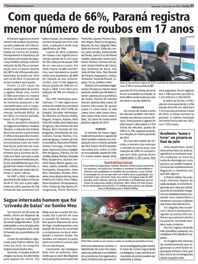 O Paraná registrou o menor número de roubos nos primeiros oito meses de 2024 dos últimos 17 anos para o período. Dados do Centro de Análise, Planejamento e Estatística, da Secretaria de Estado da Segurança Pública (Sesp), indicam redução de 66,7% na comparação com o mesmo recorte de 2007 e de 24% quando confrontados os dados de 2024 com os de 2023. O número de furtos também teve queda. Foram 12.337 casos de roubos registrados de janeiro a agosto deste ano, contra 37.066 ocorridos no mesmo período de 2007, ano em que os números passaram a ser contabilizados com a implementação do Boletim de Ocorrências Unificado (BOU). Já em 2023, no mesmo período, foram 16.297 registros. Para o secretário estadual da Segurança Pública, Hudson Teixeira, a redução nos índices de crimes contra o patrimônio é reflexo dos grandes investimentos do Estado na área e de uma presença cada vez maior das forças policiais nas ruas. “Isso é fruto de todo o investimento que o Governo do Estado tem feito, somada à ação eficaz e comprometida das polícias, possibilitando que chegássemos nesse resultado, o menor índice de roubo dos últimos 17 anos”, afirma. De 2007 a 2018, a média de ocorrências de roubo no Paraná foi de 47 mil, com o pico registrado em 2016, quando 59.138 crimes do tipo ocorreram emtodo o Estado. Se comparado o número daquele ano com o de 2024, a redução é ainda mais significativa, de 79%. A partir de 2019, o número de roubos caiu significativamente, saindo de 41.524, para 33.704, redução de quase 19% de um ano para o outro. Em 2020, houve 23.685 ocorrências, que representou queda ainda mais expressiva, de 30% em relação ao ano anterior. Já 2021, com 17.954 registros, houve queda de 24% em relação a 2020. E em 2022 uma redução de 5% em relação a 2021. Dos 399 municípios paranaenses, 77 não registraram crimes de roubo nos primeiros oito meses de 2024 (19% do Estado). São eles: Adrianópolis, Altamira do Paraná, Anahy, Ângulo, Arapuã, Atalaia, Bela Vista da Caroba, Boa Esperança do Iguaçu, Boa Ventura de São Roque, Bom Sucesso do Sul, Braganey, Brasilândia do Sul, Cafeara, Campo Bonito, Cruzeiro do Iguaçu, Cruzeiro do Sul, Cruzmaltina, Diamante d’Oeste, Doutor Camargo, Enéas Marques, Esperança Nova, Espigão Alto do Iguaçu, Flórida, Foz do Jordão, Godoy Moreira, Grandes Rios, Guapirama, Guaraci, Honório Serpa, Ibema, Iguatu, Ivatuba, Japira, Leópolis, Lobato, Mariópolis, Marquinho, Mato Rico, Mercedes, Mirador, Miraselva, Nova Aliança do Ivaí, Nova América da Colina, Nova Tebas, Novo Itacolomi, Paranapoema, Piên, Pinhal de São Bento, Pitangueiras, Porto Barreiro, Pranchita, Quatro Pontes, Rancho Alegre, Reserva do Iguaçu, Rosário do Ivaí, Salgado Filho, Salto do Itararé, Salto do Lontra, Santa Amélia, Santa Cecília do Pavão, Santa Cruz de Monte Castelo, Santa Inês, Santa Lúcia, Santa Mônica, Santana do Itararé, Santo Antônio do Caiuá, São Jerônimo da Serra, São José da Boa Vista, São Manoel do Paraná, Sapopema, Sulina, Tomazina, Tunas do Paraná, Tupãssi, Turvo, Uniflor e Verê. Outros 224 municípios registraram 10 casos ou menos nesse período, sendo que 58 deles tiveram apenas uma ocorrência de roubo. Outras 50 cidades tiveram apenas dois casos; 35 tiveram três casos; 26, quatro casos; 17, cinco casos; 13, seis casos; nove, sete casos; cinco, oito casos; nove, nove casos; e dois, 10 casos de roubo entre janeiro e agosto de 2024. FURTOS O número de furtos registrado entre janeiro e agosto de 2024 também reduziu na comparação com o mesmo período de 2023. Foram 95.875 ocorrências neste ano, contra 112.942 no ano passado, queda de 15%. É o menor índice desde 2020, quando 94.973 crimes de furto foram cometidos no Estado. O furto difere-se do roubo por não envolver o uso de violência. VEÍCULOS Os crimes de roubo e furto de veículos também vêm diminuindo nos últimos anos no Paraná. Entre janeiro e agosto de 2024, foram 1.464 roubos e 7.519 furtos de veículos, queda de 33% e 12,7%, respectivamente, em relação ao mesmo período de 2023. No caso dos roubos de veí- culos, o número caiu mais que a metade em cinco anos, com redução de 53% na compara- ção com 2020, quando foram registrados 3.163 casos. Nos anos seguintes, foram registradas 2.780 ocorrências (2021), 2.374 (2022) e 2.196 (2023). Já sobre os furtos, a redu- ção em cinco anos foi de 11,5%, saindo de 8.495 em 2020 para 7.519 nos oito primeiros meses de 2024, o menor número no período. O melhor resultado até então havia sido em 2021, com 7.591 casos.