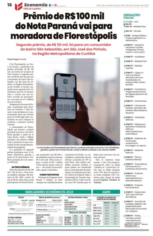 É de Florestópolis, no Norte do Estado, a ganhadora do prêmio principal, de R$ 100 mil, do sorteio de outubro do Nota Paraná. O segundo prêmio, de R$ 50 mil, foi para um consumidor do bairro São Sebastião, em São José dos Pinhais, na Região Metropolitana de Curitiba. O sorteio, realizado nesta segunda-feira (7), distribuiu mais de 35 mil prémios e contou com um número recorde de participantes, com mais de 3,17 milhões de concorrentes. Programa do Governo do Estado, coordenado pela Secretaria da Fazenda, o Nota Paraná é uma iniciativa de conscientização fiscal que devolve parte do ICMS pago pelo consumidor em suas compras no comércio e promove sorteios mensais. A consumidora de Florestópolis que faturou o prêmio principal concorreu com 29 bilhetes gerados a partir de 14 notas fiscais, sendo o bilhete sorteado o de número 132080, Essa é à primeira vez que o município recebe uma grande premiação do programa. Já o ganhador do segundo prémio participou com 14 bi lhetes eletrônicos, gerados a partir de 39 notas fiscais. O bilhete premiado foi o de número 24975144, OUTROS PRÊMIOS Além dos prêmios de R$ 100 mil e R$ 50 mil, o Nota Paranã também entregou 100 prêmios de R$ LOM) e outros 35 mil de R$ 50. Além disso, 8 mil participantes do Paraná Pay foram premiados com R$ 100, e 10 entidades sociais receberam R$ 5 mil cada. Pelas novas re gras, o sortelo de R$ 1 milhão é feito apenas quatro vezes ao ano — nos meses de fevereiro, maio, agosto e dezembro. COMO PARTICIPAR *articipar do Programa Nota Paraná é simples: ao [lazer compras nos estabelecimentos comerciais do Estado, os consumidores cadastrados devem solicitar a inclusão do CPF na nota fiscal. Essa prática possibilita acumular créditos, os quais podem ser transferidos para a conta bancária do participante ou utilizados para abater valores do Imposto sobre a Propriedade de Veículos Automotores (IPVA). Cada nota fiscal com CPF inserido gera bilhetes para concorrer nos sortetos mensais. ara se cadastrar, basta acessar o site www.notaparana.pr.gov.br, clicar na opção “cadastre-se” e preencher a fi cha com os dados pessoais, como CPF, data de nascimen to, nome completo, CEP e endereço para criação da senha pessoal (Agência Estadual de Notícias)