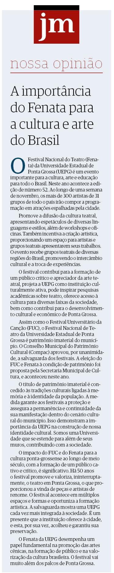 O Festival Nacional do Teatro (Fenata) da Universidade Estadual de Ponta Grossa (UEPG) é um evento importante para a cultura, arte e educação para todo o Brasil. Neste ano acontece a edição de número 52. Ao longo de uma semana de novembro, os mais de 300 artistas de 31 grupos de todo o país irão compor a programação em atrações espalhadas pela cidade.