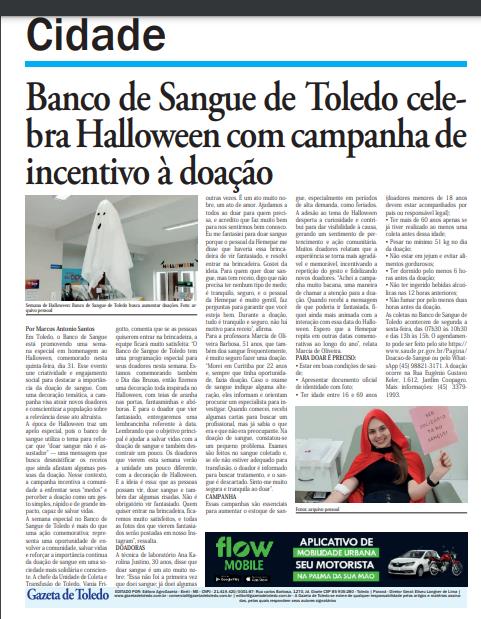 . A chefe da Unidade de Coleta e Transfusão de Toledo, Vania Frigotto, comenta que se as pessoas quiserem entrar na brincadeira, a equipe ficará muito satisfeita: “O Banco de Sangue de Toledo tem uma programação especial para seus doadores nesta semana. Estamos comemorando também o Dia das Bruxas, então fizemos uma decoração toda inspirada no Halloween, com teias de aranha nas portas, fantasminhas e abóboras. E para o doador que vier fantasiado, entregaremos uma lembrancinha referente à data. Lembrando que o objetivo principal é ajudar a salvar vidas com a doação de sangue e também descontrair um pouco. Os doadores que vierem esta semana verão a unidade um pouco diferente, com a decoração de Halloween. E a ideia é essa: que as pessoas possam vir, doar sangue e também dar algumas risadas. Não é obrigatório vir fantasiado. Quem quiser entrar na brincadeira, ficaremos muito satisfeitos, e todas as fotos dos que vierem fantasiados serão postadas em nosso Instagram”, ressalta.
