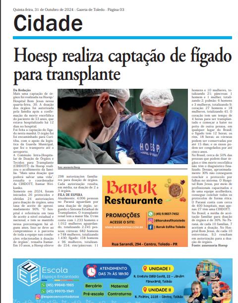 Mais uma captação de órgãos foi realizada na Hoesp/ Hospital Bom Jesus nessa quarta-feira, 30. A doação dos órgãos foi autorizada pela família após a confirmação da morte encefálica do paciente de 53 anos, que estava hospitalizado há 12 dias no hospital. Foi feita a captação do fígado nesta manhã. O órgão foi foi encaminhado para Curitiba, com o apoio da logística da Guarda Municipal, que fez o transporte até o aeroporto. A Comissão Intra-Hospitalar de Doação de Órgãos e Tecidos para Transplante (CIHDOTT) da Hoesp realizou o acolhimento da família. “Mais uma doação que poderá salvar uma vida”, ressalta o coordenador da CIHDOTT, Itamar Weikanko. Somente em 2024, foram iniciados 26 protocolos e obtidas 24 autorizações para doação de órgãos, uma taxa de aceite de aproximadamente 90%. “O hospital é referência em taxa de aceite a nível estadual e nacional, e tem se mantido nessa porcentagem há alguns anos. Isso se deve ao compromisso e à parceria de toda a equipe nas conduções relacionadas à doação de órgãos”, ressalta Itamar. Em 10 anos, a Hoesp obteve Foto: assessoria Hoesp 298 autorizações familiares para doação de órgãos. Cada autorização resulta, em média, na doação de 2 a 3 órgãos. FILA DE ESPERA Atualmente, 4.006 pessoas no Paraná aguardam por uma doação de órgão, segundo o Sistema Estadual de Transplantes.