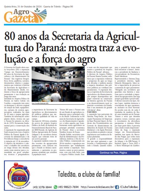 A estrutura também tem o apoio de sete estagiários e 30 residentes técnicos. Três instituições estão vinculaFoto: Geraldo Bubniak/AEN das à Seab. A Centrais de Abastecimento do Paraná (Ceasa) foi criada em 1972 e imediatamente passou a integrar a estrutura da secretaria participando de planos e programas, visando ao abastecimento e à segurança alimentar. A Agência de Defesa Agropecuária (Adapar) foi criada em 2011 assumindo as funções de defesa sanitária animal e vegetal após a extinção do Departamento de Fiscalização (Defis). A terceira vinculada passou a fazer parte da estrutura em 2019. O Instituto de Desenvolvimento Rural do Paraná – Iapar-Emater (IDR-Paraná) foi resultado da incorporação do Instituto de Assistência Técnica e Extensão Rural (Emater), da Companhia de Desenvolvimento Agropecuário do Paraná (Codapar), do Centro Paranaense de Referência em Agroecologia (CPRA) e do Instituto Agronômico do Paraná (Iapar), unindo pesquisa, assistência técnica e extensão rural em uma mesma unidade. Com apoio técnico e esforço de milhares de pessoas, o Paraná chega em 2024 com um Valor Bruto de Produção Agropecuária de quase R$ 200 bilhões, liderança em alguns segmentos (feijão, cevada, frangos e peixes) e protagonismo internacional em outros (soja, trigo, milho, suínos e leite). O agronegócio também representa cerca de 70% da pauta de exportações, fruto de um trabalho de grandes e pequenas agroindústrias e do cooperativismo. PRESENÇAS Também participaram do evento o diretor-presidente do IDR- -Paraná, Richard Golba; a diretora de Gestão Institucional do IDR-PR, Solange Coelho; o diretor-administrativo da Adapar, Adalberto Valiatti; o diretor administrativo e financeiro da Ceasa Paraná, João Luiz Buso; o diretor-presidente do Tecpar, Celso Kloss; o diretor florestal da Águia Florestal, Álvaro Sheffer Junior; o superintendente da Ocepar, Nelson Costa; o proprietário do Mercado das Pulgas, Jefferson Silva; o diretor do setor de Ciências Agrárias da Universidade Federal do Paraná (UFPR), Volnei Pauletti, o secretário municipal de Segurança Alimentar e Nutricional, Luiz Gusi; o deputado estadual Professor Lemos, além de servidores e ex-servidores do Sistema Estadual de Agricultura (Seagri). INFORMAÇÕES Os visitantes podem conferir a exposição de segunda a sexta- -feira, das 9h às 12h e das 13h às 17h, na sede do Arquivo Público do Paraná. Mais informações podem ser obtidas pelos telefones (41) 3521-9100 ou (41) 3313-4003. Fonte: AEN