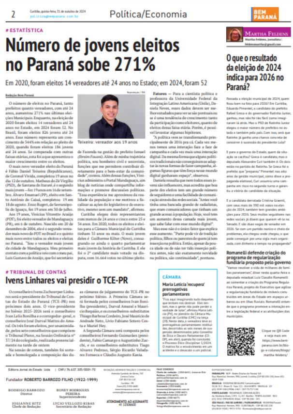 Passada a eleição municipal de 2024, quem fi cou bem na foto para 2026? Em Curitiba, Eduardo Pimentel, o candidato do prefeito Rafael Greca e do governador Ratinho Junior, ganhou, mas não foi tão fácil como imaginaram lá atrás. Mas o PSD de Ratinho Junior elegeu o maior número de prefeitos no estado e também pelo país. Com isso, será que Ratinho já ganha uma chance concreta de concorrer à sucessão do presidente Lula? E para o governo do Estado, quem da situação se cacifou? Greca é candidato, mas o deputado Alexandre Curi também é. Os dois estão no partido de Ratinho. Se Greca foi o prefeito que “preparou” Pimentel nos oito anos da gestão municipal, como disse a propaganda eleitoral, Curi assumiu uma campanha em risco no segundo turno e garantiu a vitória do candidato da situação. E a candidata derrotada Cristina Graeml, com seus mais de 390 mil votos na eleição de 2024, também tem grandes ambições para 2026. Seus muitos seguidores nas redes sociais já dizem que querem vê-la no Senado. E são duas vagas de senador em 2026. Se com um partido nanico e cheio de problemas, ela chegou onde chegou, o que pode conseguir por uma sigla mais organizada, com dinheiro e tempo na propaganda?