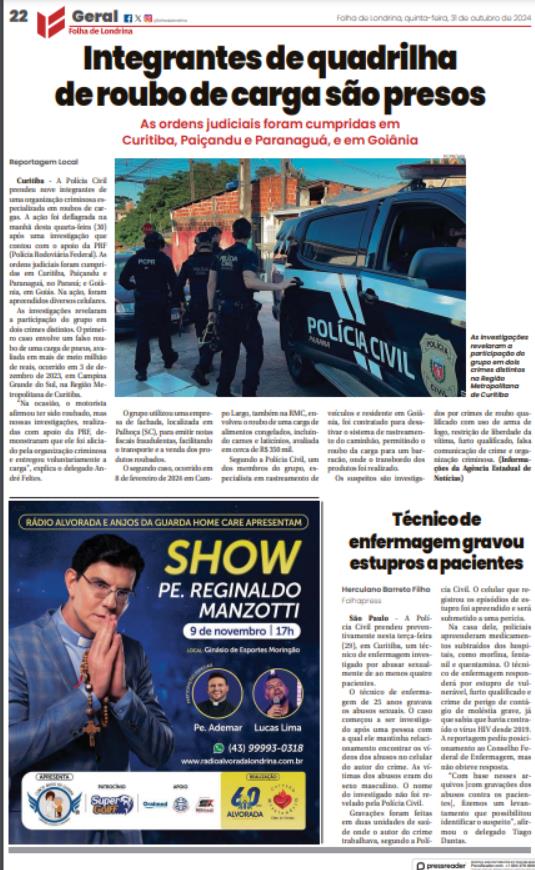 Curitiba - A Polícia Civil prendeu nove integrantes de uma organização criminosa especializada em roubos de cargas. A ação foi deflagrada na manhã desta quarta-feira (30) após uma investigação que contou com o apoio da PRF (Polícia Rodoviária Federal). As ordens judiciais foram cumpridas em Curitiba, Paiçandu e Paranaguá, no Paraná; e Goiânia, em Goiás. Na ação, foram apreendidos diversos celulares. As investigações revelaram a participação do grupo em dois crimes distintos. O primeiro caso envolve um falso roubo de uma carga de pneus, avaliada em mais de meio milhão de reais, ocorrido em 3 de dezembro de 2023, em Campina Grande do Sul, na Região Metropolitana de Curitiba. “Na ocasião, o motorista afirmou ter sido roubado, mas nossas investigações, realizadas com apoio da PRF, demonstraram que ele foi aliciado pela organização criminosa e entregou voluntariamente a carga”, explica o delegado André Feltes. O grupo utilizou uma empresa de fachada, localizada em Palhoça (SC), para emitir notas fiscais fraudulentas, facilitando o transporte e a venda dos produtos roubados. O segundo caso, ocorrido em 8 de fevereiro de 2024 em Campo Largo, também na RMC, envolveu o roubo de uma carga de alimentos congelados, incluindo carnes e laticínios, avaliada em cerca de R$ 350 mil. Segundo a Polícia Civil, um dos membros do grupo, especialista em rastreamento de veículos e residente em Goiânia, foi contratado para desativar o sistema de rastreamento do caminhão, permitindo o roubo da carga para um barracão, onde o transbordo dos produtos foi realizado. Os suspeitos são investigados por crimes de roubo qualificado com uso de arma de fogo, restrição de liberdade da vítima, furto qualificado, falsa comunicação de crime e organização criminosa. (Informações da Agência Estadual de Notícias)