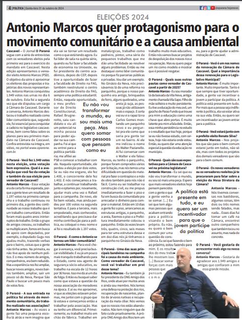Eu não, eu quero o bem comum por uma questão de consciência. Eu sei que fazendo o bem ao próximo, estou fazendo para mim. E os resultados do meu trabalho mostram isso. [...] Buscar somar forças com mais pessoas que p e n s a m c o m o eu, para a gente ajudar a administração de Cascavel. O Paraná - Você é um nos nomes da renovação da Câmara de Cascavel. Qual a importância dessa renovação para o Legislativo Municipal? Antonio Marcos - É muito importante. Muito importante. Tanto é que sempre que tiver oportunidade, a gente vai incentivar o jovem a participar da política. A política está presente em tudo. Por mais que a pessoa seja indiferente à política, ela vai estar ativa na sua vida. Então, eu quero ser um incentivador ao jovem entrar para a política. O Paraná - Você estará junto com o prefeito eleito Renato Silva? Antonio Marcos - Nos projetos que são para o bem comum estarei junto em todos, não só ele, mas com todos os projetos dos demais vereadores que são para o bem comum. O Paraná - Os noves vereadores ou os vereadores reeleitos já te procuraram para falar sobre a eleição da Mesa Diretora da Câmara? Antonio Marcos - Nós tivemos conversas nos bastidores, algumas coisas, têm dois ou três nomes sendo falados, mas nada... Esses dias fui tomar um café na Câmara, encontrei outro companheiro que também tocou no assunto, mas nada de concreto. O Paraná - Você gostaria de acrescentar mais algo na nossa conversa? Antonio Marcos - Gostaria de agradecer aos 1.949 amigos e amigas que confiaram a mim essa grande missão.