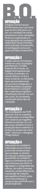 “As investigações da PCPR apontam que os suspeitos armazenavam e compartilha- vam material pornográfico infantil na internet. Em um dos casos, também houve a produção desse material e a prática de estupro de vulnerável”, informou o delegado Thiago Soares.