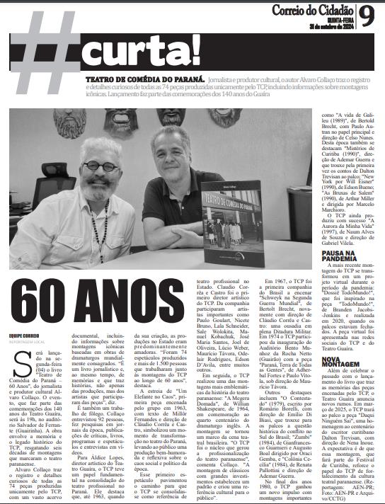 Será lançado na segunda-feira (04) o livro "Teatro de Comédia do Paraná – 60 Anos", do jornalista e produtor cultural Al- varo Collaço. O evento, que faz parte das comemorações dos 140 anos do Teatro Guaíra, será às 19h, no auditório Salvador de Ferran- te (Guairinha). A obra envolve a memória e o legado histórico do TCP, resgatando seis décadas de montagens que marcaram o teatro paranaense. Alvaro Collaço traz o registro e detalhes curiosos de todas as 74 peças produzidas unicamente pelo TCP, com um vasto acervo documental, incluindo informações sobre montagens icônicas baseadas em obras de dramaturgos mundial- mente consagrados. “É um livro jornalístico e, ao mesmo tempo, de memórias e que traz histórias, não apenas das produções, mas dos artistas que participaram das peças”, diz. É também um traba- lho de fôlego. Collaço entrevistou 92 pessoas, fez pesquisas em jor- nais da época, publicações de críticas, livros, programas e espetáculos e entrevistas em ví- deos. Para Áldice Lopes, diretor artístico do Tea- tro Guaíra, o TCP teve um papel fundamental na consolidação do teatro profissional no Paraná. Ele destaca que, até 1963, quando da sua criação, as produções no Estado eram predominantemente amadoras. “Foram 74 espetáculos produzidos e mais de 1.500 pessoas que trabalharam junto às montagens do TCP ao longo de 60 anos", destaca. A estreia de "Um Elefante no Caos", primeira peça encenada pelo grupo em 1963, com texto de Millôr Fernandes e direção de Cláudio Corrêa e Cas- tro, simbolizou um momento de transformação no teatro do Paraná, levando ao público uma produção bem-humora- da e reflexiva sobre o caos social e político da época. Esse primeiro espetáculo pavimentou o caminho para que o TCP se consolidasse como referência de teatro profissional no Estado. Claudio Corrêa e Castro foi o primeiro diretor artístico do TCP. Da companhia participaram artistas importantes como Paulo Goulart, Nicete Bruno, Lala Schneider, Sale Wolokita, Manuel Kobachuk, José Maria Santos, Joel de Oliveira, Lúcio Weber, Maurício Távora, Ode- lair Rodrigues, Edson D’Avila, entre muitos outros. Em seguida, o TCP realizou uma das montagens mais emblemáticas da história do teatro paranaense: "A Megera Domada", de Willian Shakespeare, de 1964, em comemoração ao quarto centenário do dramaturgo inglês. A montagem se tornou um marco da cena teatral brasileira. "O TCP foi o núcleo que gerou a profissionalização do teatro paranaense", comenta Collaço. "A montagem de clássicos com grandes investimentos estabeleceu um padrão e criou uma referência cultural para o público”. Em 1967, o TCP foi a primeira companhia do Brasil a encenar "Schweyk na Segunda Guerra Mundial", de Bertolt Brecht, novamente com direção de Cláudio Corrêa e Castro: uma ousadia em plena Ditadura Militar. Em 1974 o TCP participou da inauguração do Auditório Bento Mu- nhoz da Rocha Netto (Guairão) com a peça "Paraná, Terra de Todas as Gentes", de Adherbal Fortes e Paulo Vitola, sob direção de Maurício Távora. Outros destaques incluem "O Contestado" (1979), escrito por Romário Borelli, com direção de Emílio Di Biasi, que trouxe para os palcos a questão histórica do conflito no Sul do Brasil; "Zumbi" (1984), de Gianfrancesco Guarnieri e Augusto Boal dirigido por Oraci Gemba, e "Colônia Cecília" (1984), de Renata Pallottini e direção de Ademar Guerra. No final dos anos 1980, o TCP ganhou um novo impulso com montagens importantes como "A vida de Galileu (1989)", de Bertold Brecht, com Paulo Autran no papel principal e direção de Celso Nunes. Desta época também se destacam "Mistérios de Curitiba (1990)", dire- ção de Ademar Guerra e que trouxe pela primeira vez os contos de Dalton Trevisan ao palco; "New York por Will Eisner" (1990), de Edson Bueno; "As Bruxas de Salem" (1990), de Arthur Miller e dirigida por Marcelo Marchioro. O TCP ainda pro- duziu com sucesso "A Aurora da Minha Vida" (1997), de Naum Alves de Souza e direção de Gabriel Vilela. PAUSA NA PANDEMIA A mais recente montagem do TCP se trans- formou em um projeto virtual durante o período da pandemia: "Dossiê TodoMundo!", que foi inspirado na peça "TodoMundo!", de Branden Jacobs- -Jenkins e realizada em 2020, quando os palcos estavam fechados. A peça virtual foi apresentada nas redes sociais do TCP e do Teatro Guaíra. NOVA MONTAGEM Além de celebrar o passado com o lançamento do livro que traz as memórias das peças encenadas pelo TCP, o Teatro Guaíra anuncia novos rumos. Em março de 2025, o TCP trará ao palco a peça "Daqui Ninguém Sai", uma homenagem ao centenário do escritor curitibano Dalton Trevisan, com direção de Nena Inoue. A expectativa é de que essa montagem, que fará parte do Festival de Curitiba, reforce o papel do TCP de for- talecimento da cultura teatral paranaense.