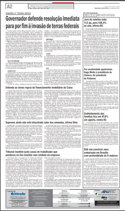O governador Carlos Massa Ratinho Junior se reuniu nesta quarta-feira (30), em Brasília, com o ministro do Supremo Tribunal Federal (STF) Gilmar Mendes, e reforçou a necessidade de resolução imediata das invasões de terras no Oeste do Paraná, principalmente em Guaíra e Terra Roxa. A ideia é evitar uma escalada da violência e dar uma solução definitiva que garanta a segurança dos agricultores, indígenas e moradores da região. Durante a reunião, que foi acompanhada pelo presidente da Frente Parlamentar da Agropecuária (FPA), deputado federal Pedro Lupion, e o procurador-geral do Estado, Luciano Borges, Ratinho Junior reforçou o pedido da análise do STF de uma ação movida pelos partidos PP, PL e Republicanos que pede a autorização para que as polícias Militar e Civil estaduais possam auxiliar no plano de ação para eventuais reintegrações de posse de propriedades privadas. Por se tratar de invasão promovida por indígenas, a administração estadual não tem poder, nas atuais condições, para estabelecer sozinha uma mediação, que deve ser assumida pela União e o Poder Judiciário. NA ILHA GRANDE Outra proposta feita pelo governador do Paraná é para que Gilmar Mendes analise a possibilidade de cessão de uma área de aproximadamente 40 mil hectares em Ilha Grande, próxima à Guaíra, e que poderia ser utilizada para o reassentamento dos indígenas. CONFLITOS Desde janeiro, os casos de violência envolvendo o conflito são relatados na região. Em julho, uma propriedade rural da localidade São Domingos, em Guaíra, foi invadida por cerca de 20 indígenas. Naquela ocasião, os invasores agrediram o filho do proprietário, que precisou ser hospitalizado, o que motivou o Sindicato Rural de Guaíra a se manifestar com medo de que novas ocorrências pudessem acabar em fatalidades. No fim de agosto, indígenas ficaram feridos em um conflito e, em setembro, um oficial da Força Nacional foi agredido por indígenas e teve o seu fuzil roubado em no município vizinho de Terra Roxa. Desde então, os órgãos públicos têm recebido outras denúncias sobre tentativas de invasão e outros episódios de violência. REFORÇO Para garantir a segurança da população, Ratinho Junior determinou que a Secretaria de Estado da Segurança Pública (Sesp) reforçasse o policiamento na região com equipes especializadas do Batalhão de Polícia de Choque, Batalhão de Polícia Militar da Fronteira e patrulhamento aéreo. “Os policiais militares estão dando apoio ao trabalho realizado pela Polícia Federal e a Força Nacional”, garantiu o governador. FUNAI Paralelamente, o Governo do Paraná também tem cobrado o Ministério da Justiça e Segurança Pública, o Ministério do Desenvolvimento Agrário e Agricultura Familiar e a Fundação Nacional dos povos Indígenas (Funai) para uma resolução que contemple o bem-estar de todos. Apesar das cobranças do Governo do Estado, a situação se arrasta há alguns meses, o que causa insegurança a todos os envolvidos, inclusive dos próprios indígenas. STF O ministro Gilmar Mendes é relator de cinco ações que discutem a lei aprovada pelo Congresso em outubro de 2023 sobre o chamado Marco Temporal, tese considerada inconstitucional pela Corte. Pela legislação aprovada pelos deputados federais, só poderiam haver demarcações das terras que eram habitadas pelos povos indígenas em 5 de outubro de 1988, data da promulgação da Constituição Federal. “Essa situação da demarcação já está judicializada e em análise no STF, mas não podemos perder tempo ou fechar os olhos para o que está acontecendo, sob o risco de assistir a uma tragédia”, defendeu Ratinho Junior.