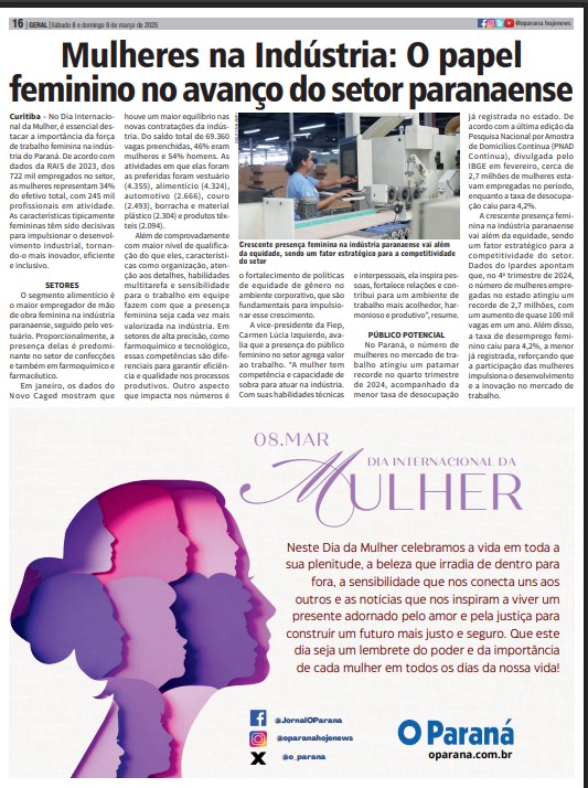 Curitiba – No Dia Internacional da Mulher, é essencial destacar a importância da força de trabalho feminina na indústria do Paraná. De acordo com dados da RAIS de 2023, dos 722 mil empregados no setor, as mulheres representam 34% do efetivo total, com 245 mil profissionais em atividade. As características tipicamente femininas têm sido decisivas para impulsionar o desenvolvimento industrial, tornando-o mais inovador, eficiente e inclusivo.