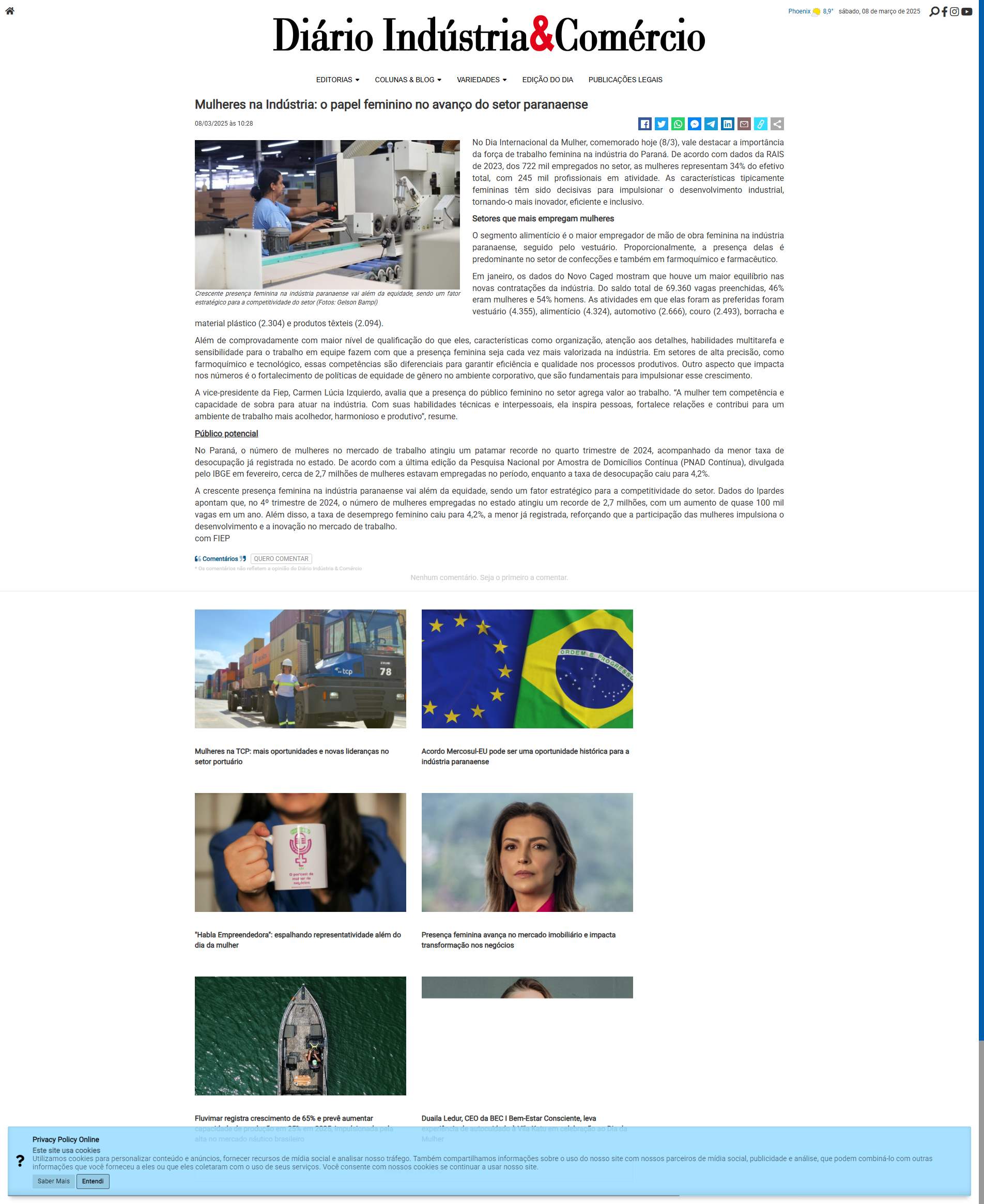 Paraná. De acordo com dados da RAIS de 2023, dos 722 mil empregados no setor, as mulheres representam 34% do efetivo total, com 245 mil profissionais em atividade. As características tipicamente femininas têm sido decisivas para impulsionar o desenvolvimento industrial, tornando-o mais inovador, eficiente e inclusivo.