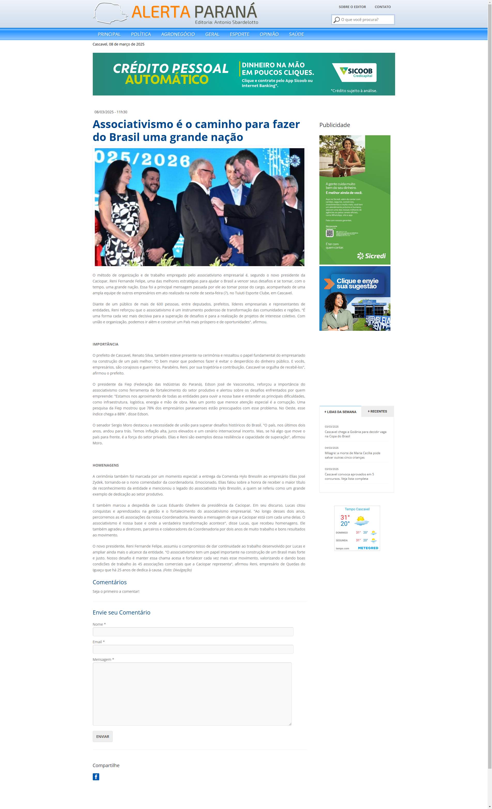 Diante de um público de mais de 600 pessoas, entre deputados, prefeitos, líderes empresariais e representantes de entidades, Reni reforçou que o associativismo é um instrumento poderoso de transformação das comunidades e regiões. "É uma forma cada vez mais decisiva para a superação de desafios e para a realização de projetos de interesse coletivo. Com união e organização, podemos ir além e construir um País mais próspero e de oportunidades", afirmou.