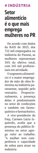 De acordo com dados da RAIS de 2023, dos 722 mil empregados na indústria do Paraná, as mulheres representam 34% do efetivo total, com 245 mil profissionais em atividade. O segmento alimenticio é o maior empregador de mão de obra feminina na indústria paranaense, seguido pelo vestuário. Proporcionalmente, a presença delas é predominante no setor de confecções e também em farmoquímico e farmacêutico. A vice-presidente da Fiep, Carmen Lúcia Izquierdo, avalia que a presença do público feminino no setor agrega valor ao trabalho. “A mulher tem competência e capacidade de sobra para atuar na indústria