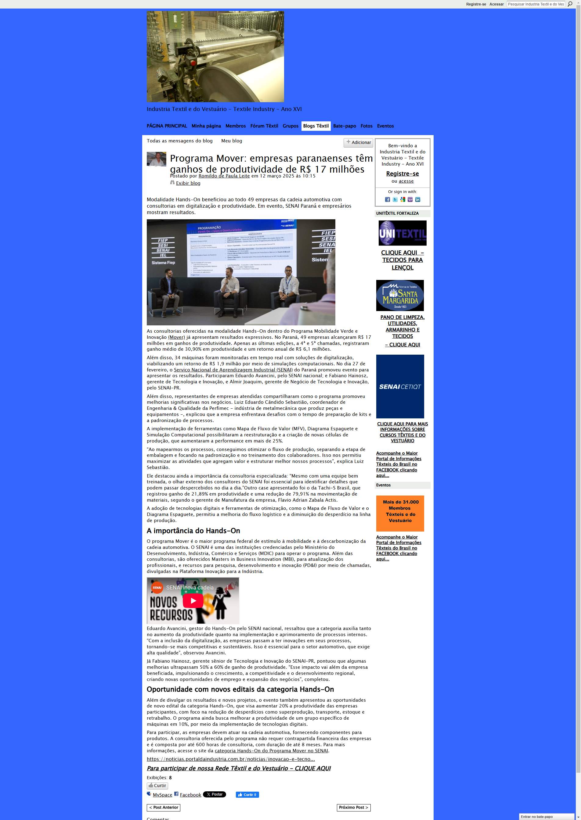 Programa Mover: empresas paranaenses têm ganhos de produtividade de R$ 17 milhões - Industria Textil e do Vestuário - Textile Industry - Ano XVI Procurar Registre-se Acessar Industria Textil e do Vestuário - Textile Industry - Ano XVI PÁGINA PRINCIPAL Minha página Membros Fórum Têxtil Grupos Blogs Têxtil Bate-papo Fotos Eventos Todas as mensagens do blog Meu blog Adicionar Programa Mover: empresas paranaenses têm ganhos de produtividade de R$ 17 milhões Postado por Romildo de Paula Leite em 12 março 2025 às 10:15 Exibir blog Modalidade Hands-On beneficiou ao todo 49 empresas da cadeia automotiva com consultorias em digitalização e produtividade. Em evento, SENAI