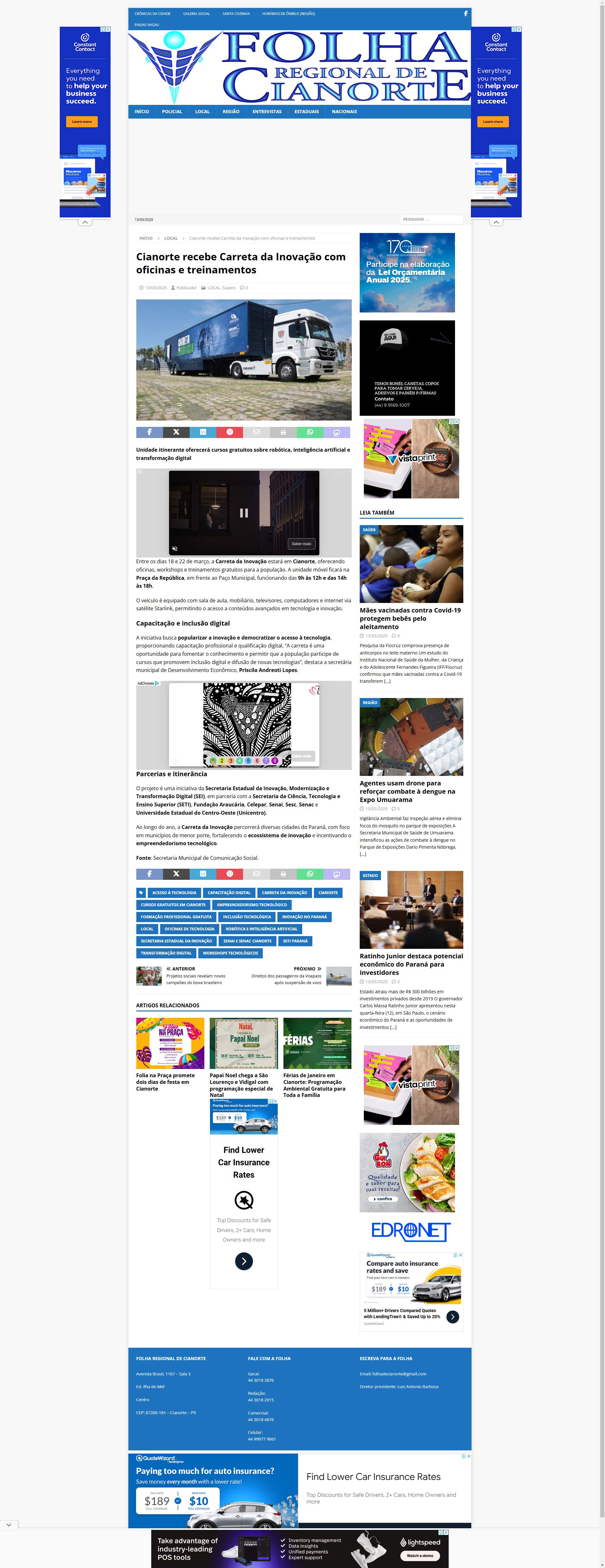 Cianorte, oferecendo oficinas, workshops e treinamentos gratuitos para a população. A unidade móvel ficará na Praça da República, em frente ao Paço Municipal, funcionando das 9h às 12h e das 14h às 18h.