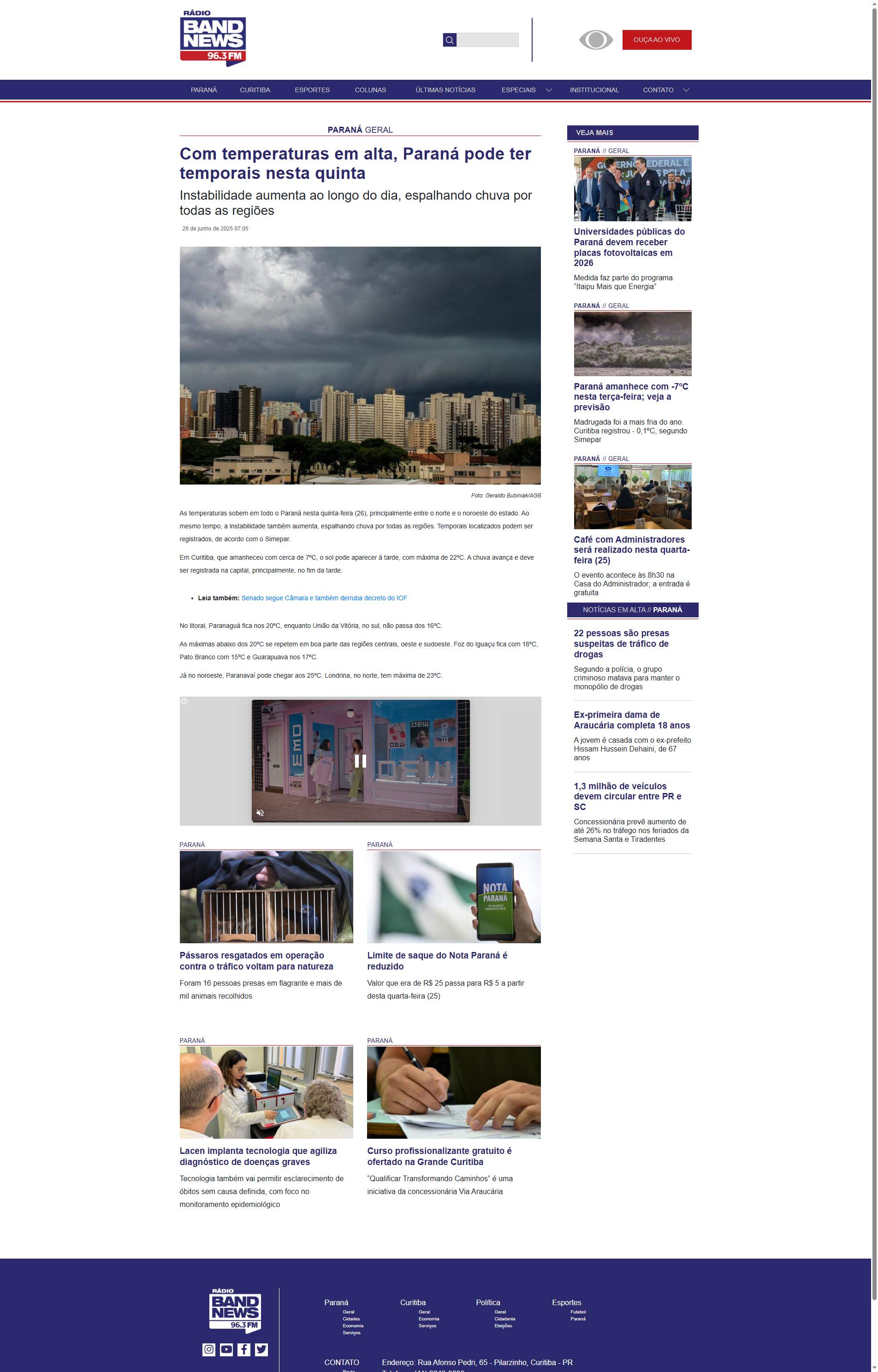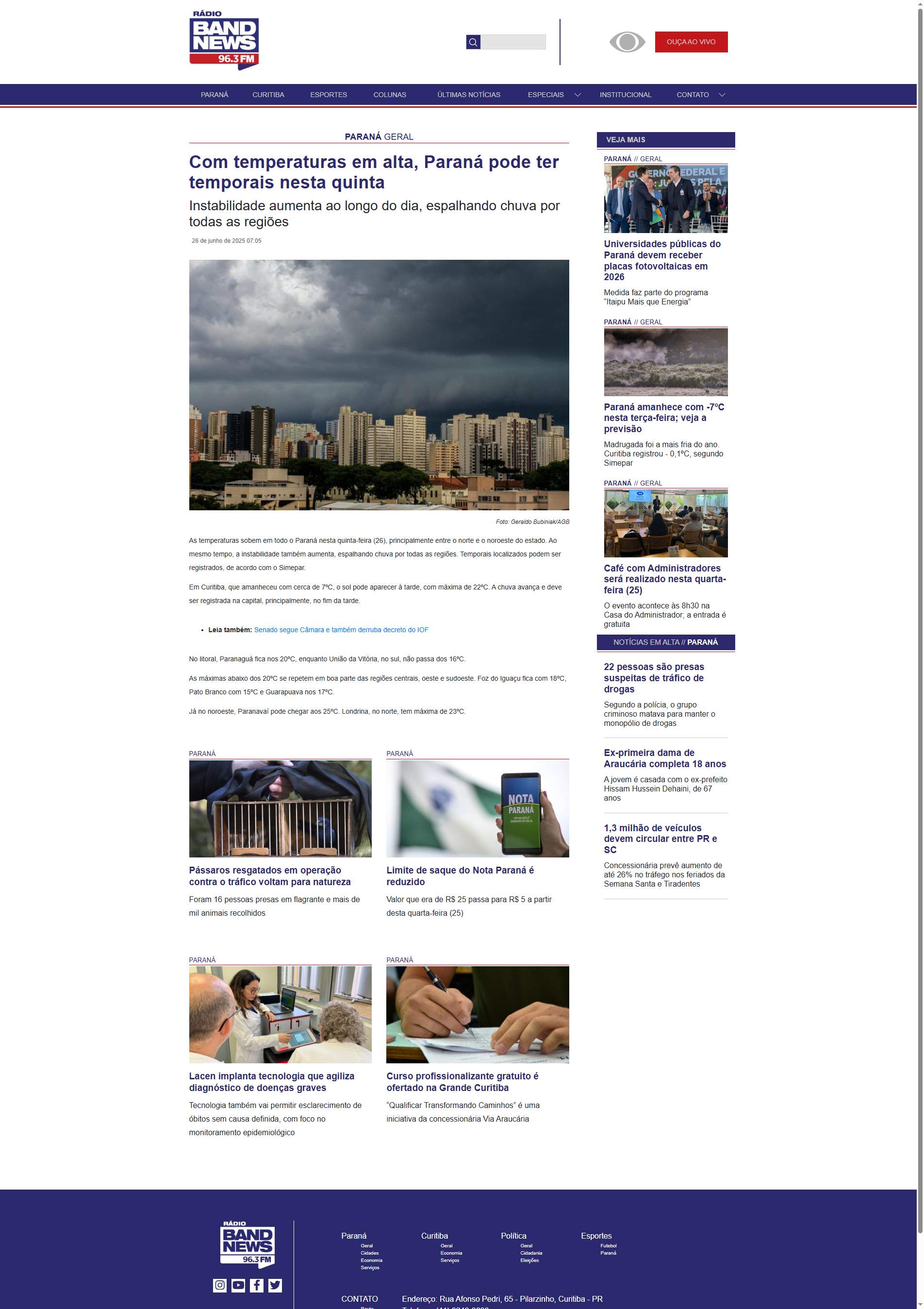 As temperaturas sobem em todo o Paraná nesta quinta-feira (26), principalmente entre o norte e o noroeste do estado. Ao mesmo tempo, a instabilidade também aumenta, espalhando chuva por todas as regiões. Temporais localizados podem ser registrados, de acordo com o