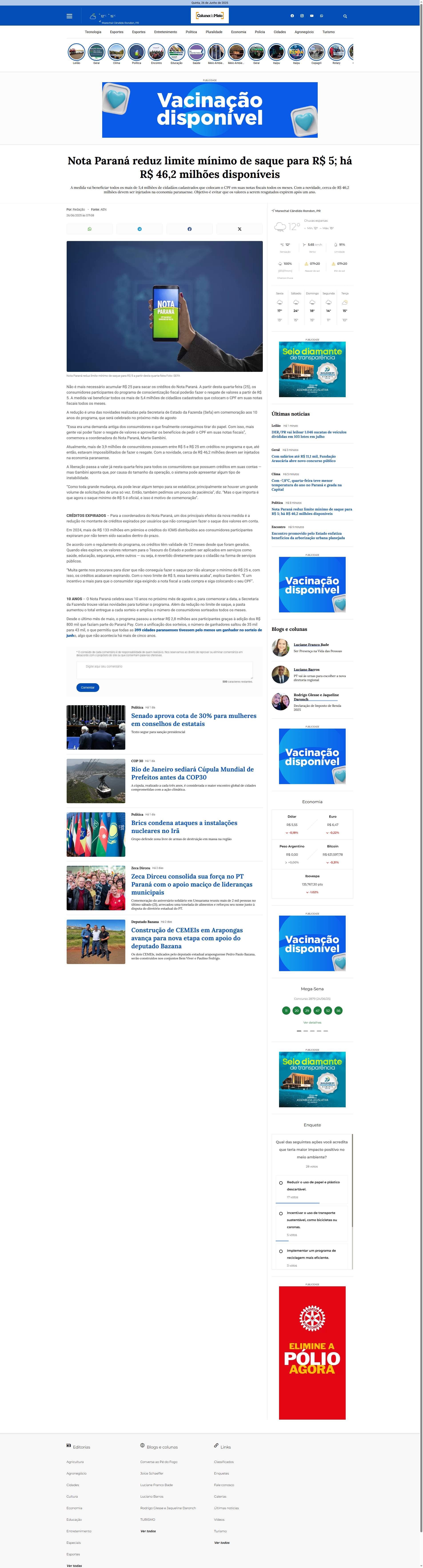 Nota Paraná. A partir desta quarta-feira (25), os consumidores participantes do programa de conscientização fiscal poderão fazer o resgate de valores a partir de R$ 5. A medida vai beneficiar todos os mais de 5,4 milhões de cidadãos cadastrados que colocam o CPF em suas notas fiscais todos os meses.