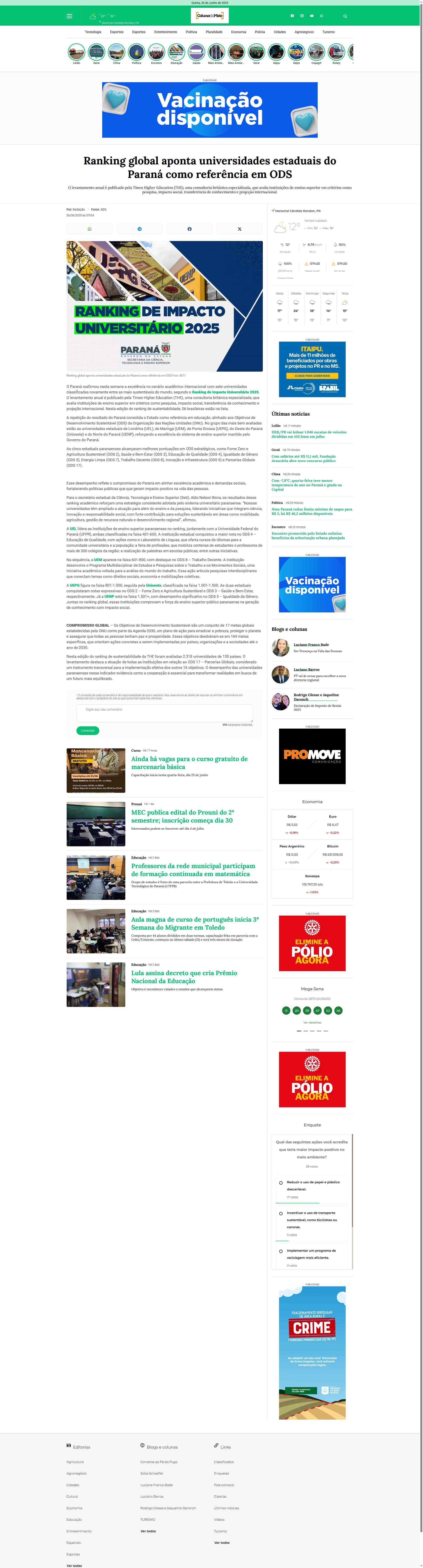 O Paraná reafirmou nesta semana a excelência no cenário acadêmico internacional com sete universidades classificadas novamente entre as mais sustentáveis do mundo, segundo o Ranking de Impacto Universitário 2025. O levantamento anual é publicado pela Times Higher Education (THE), uma consultoria britânica especializada, que avalia instituições de ensino superior em critérios como pesquisa, impacto social, transferência de conhecimento e projeção internacional. Nesta edição do ranking de sustentabilidade, 56 brasileiras estão na lista.