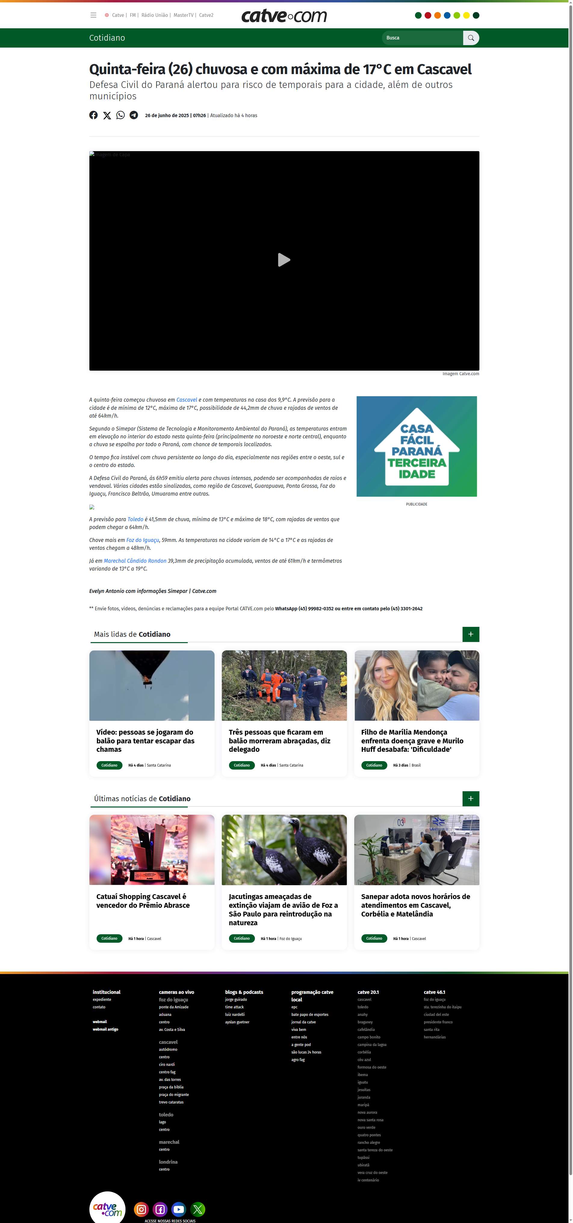 A quinta-feira começou chuvosa em Cascavel e com temperaturas na casa dos 9,9°C. A previsão para a cidade é de mínima de 12°C, máxima de 17°C, possibilidade de 44,2mm de chuva e rajadas de ventos de até 64km/h.