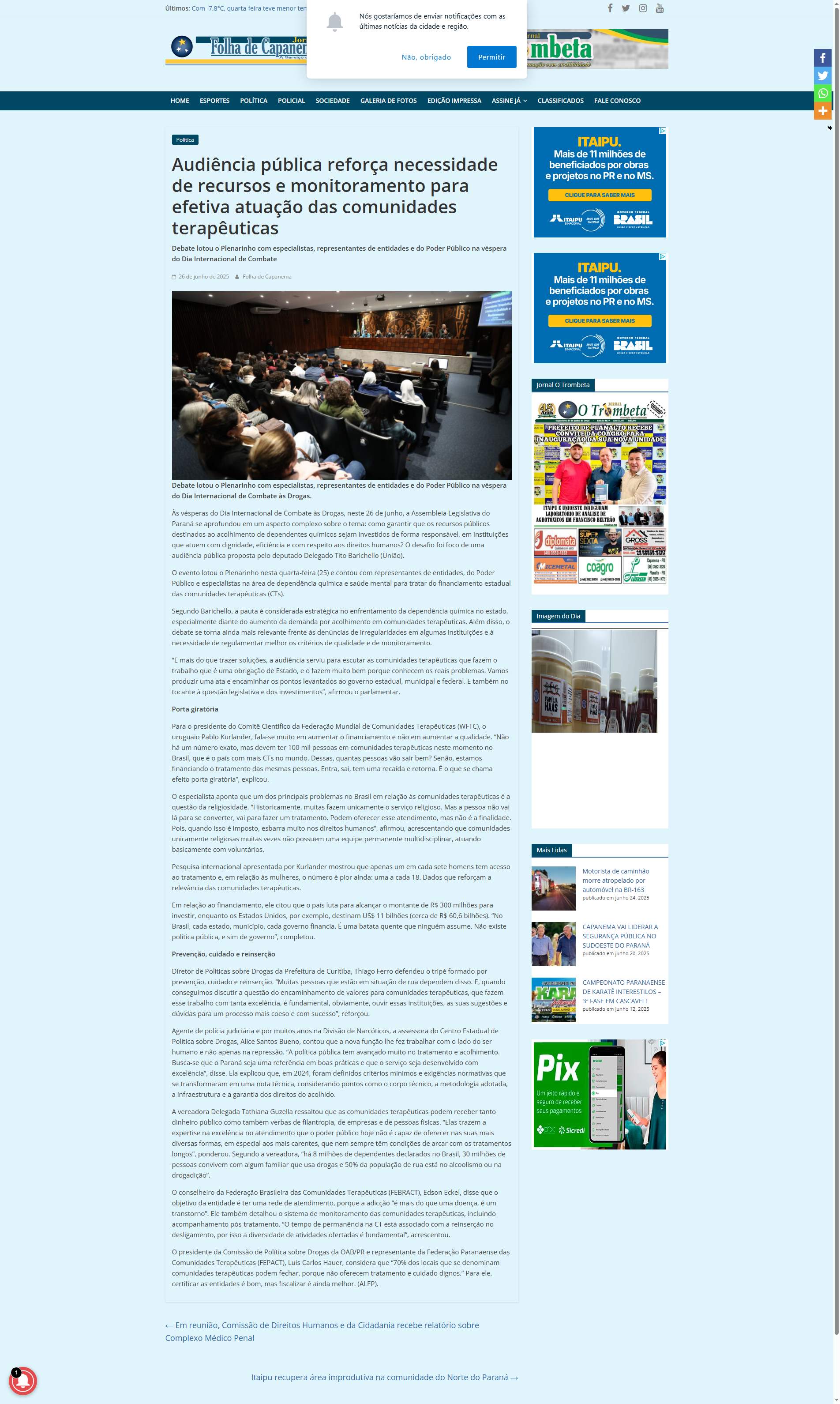 Às vésperas do Dia Internacional de Combate às Drogas, neste 26 de junho, a Assembleia Legislativa do Paraná se aprofundou em um aspecto complexo sobre o tema: como garantir que os recursos públicos destinados ao acolhimento de dependentes químicos sejam investidos de forma responsável, em instituições que atuem com dignidade, eficiência e com respeito aos direitos humanos? O desafio foi foco de uma audiência pública proposta pelo deputado Delegado Tito Barichello (União).