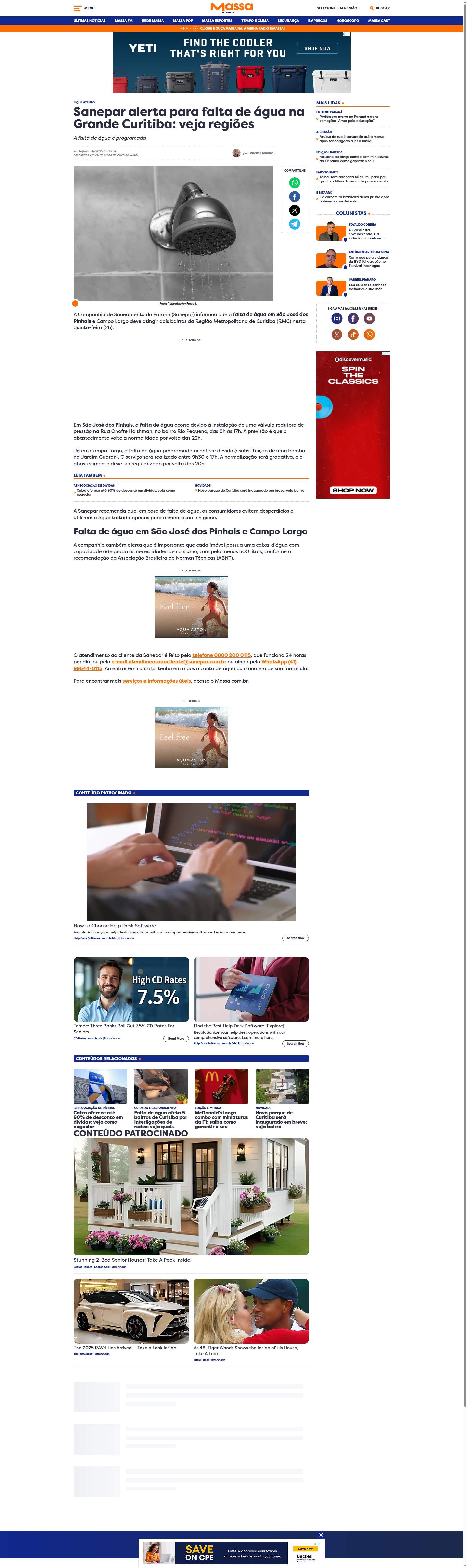 Sanepar) informou que a falta de água em São José dos Pinhais e Campo Largo deve atingir dois bairros da Região Metropolitana de Curitiba (RMC) nesta quinta-feira (26).