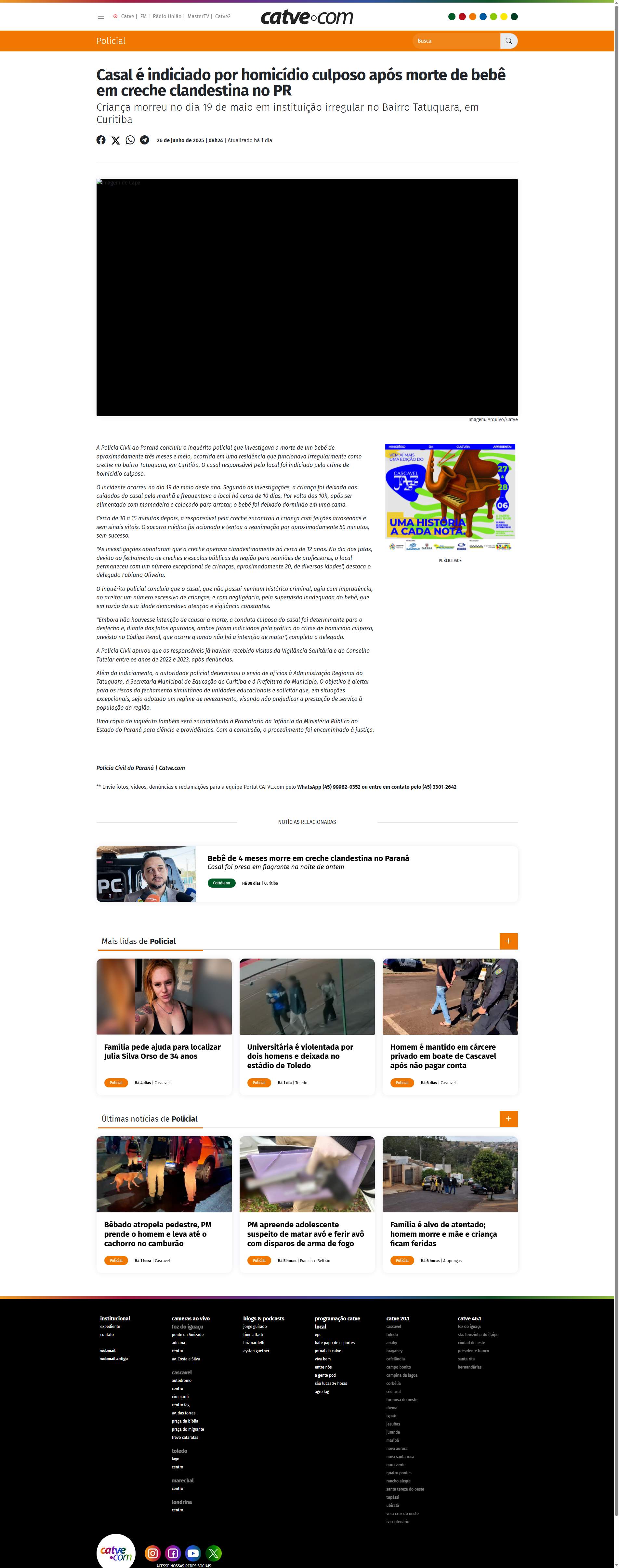 Polícia Civil do Paraná concluiu o inquérito policial que investigava a morte de um bebê de aproximadamente três meses e meio, ocorrida em uma residência que funcionava irregularmente como creche no bairro Tatuquara, em Curitiba. O casal responsável pelo local foi indiciado pelo crime de homicídio culposo.