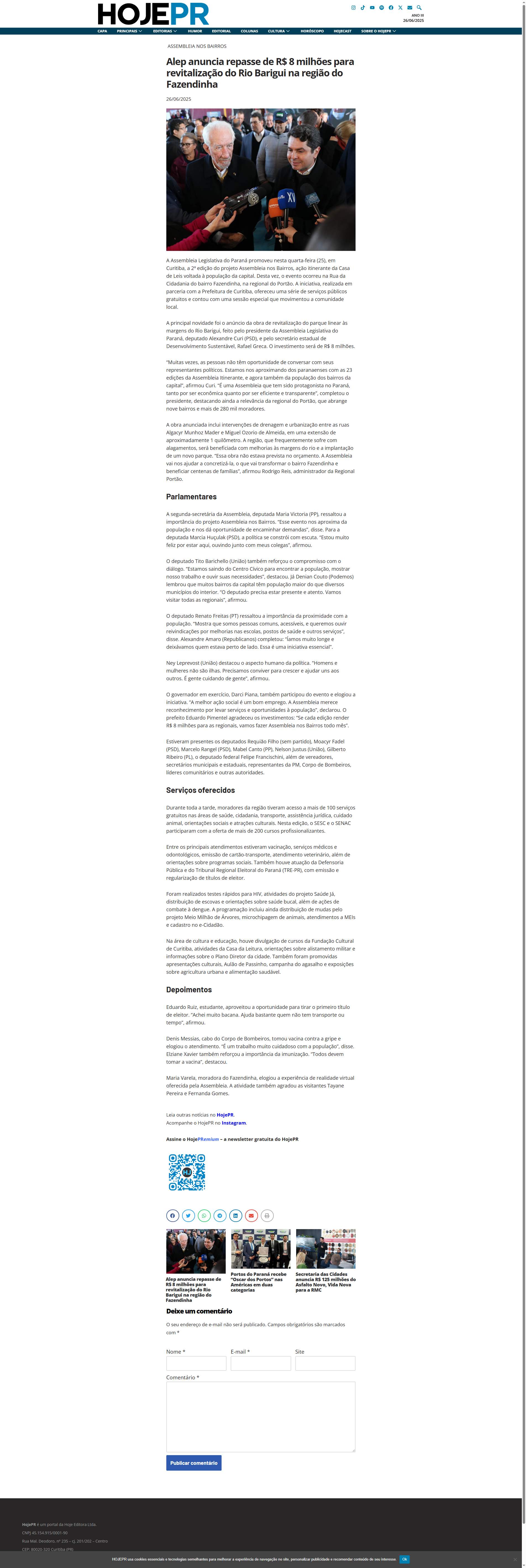A obra anunciada inclui intervenções de drenagem e urbanização entre as ruas Algacyr Munhoz Mader e Miguel Ozorio de Almeida, em uma extensão de aproximadamente 1 quilômetro. A região, que frequentemente sofre com alagamentos, será beneficiada com melhorias às margens do rio e a implantação de um novo parque. “Essa obra não estava prevista no orçamento. A Assembleia vai nos ajudar a concretizá-la, o que vai transformar o bairro Fazendinha e beneficiar centenas de famílias”, afirmou Rodrigo Reis, administrador da Regional Portão.