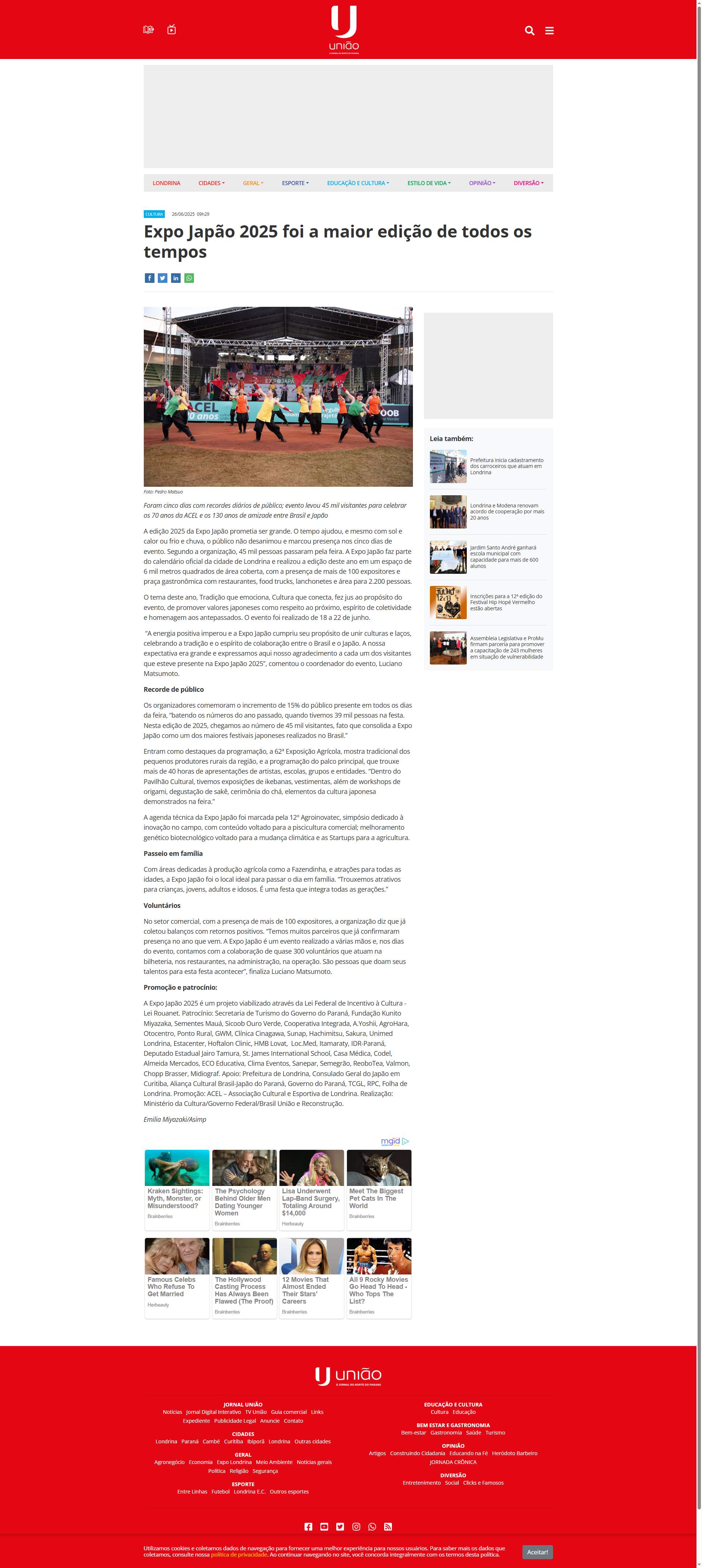 A edição 2025 da Expo Japão prometia ser grande. O tempo ajudou, e mesmo com sol e calor ou frio e chuva, o público não desanimou e marcou presença nos cinco dias de evento. Segundo a organização, 45 mil pessoas passaram pela feira. A Expo Japão faz parte do calendário oficial da cidade de Londrina e realizou a edição deste ano em um espaço de 6 mil metros quadrados de área coberta, com a presença de mais de 100 expositores e praça gastronômica com restaurantes, food trucks, lanchonetes e área para 2.200 pessoas.