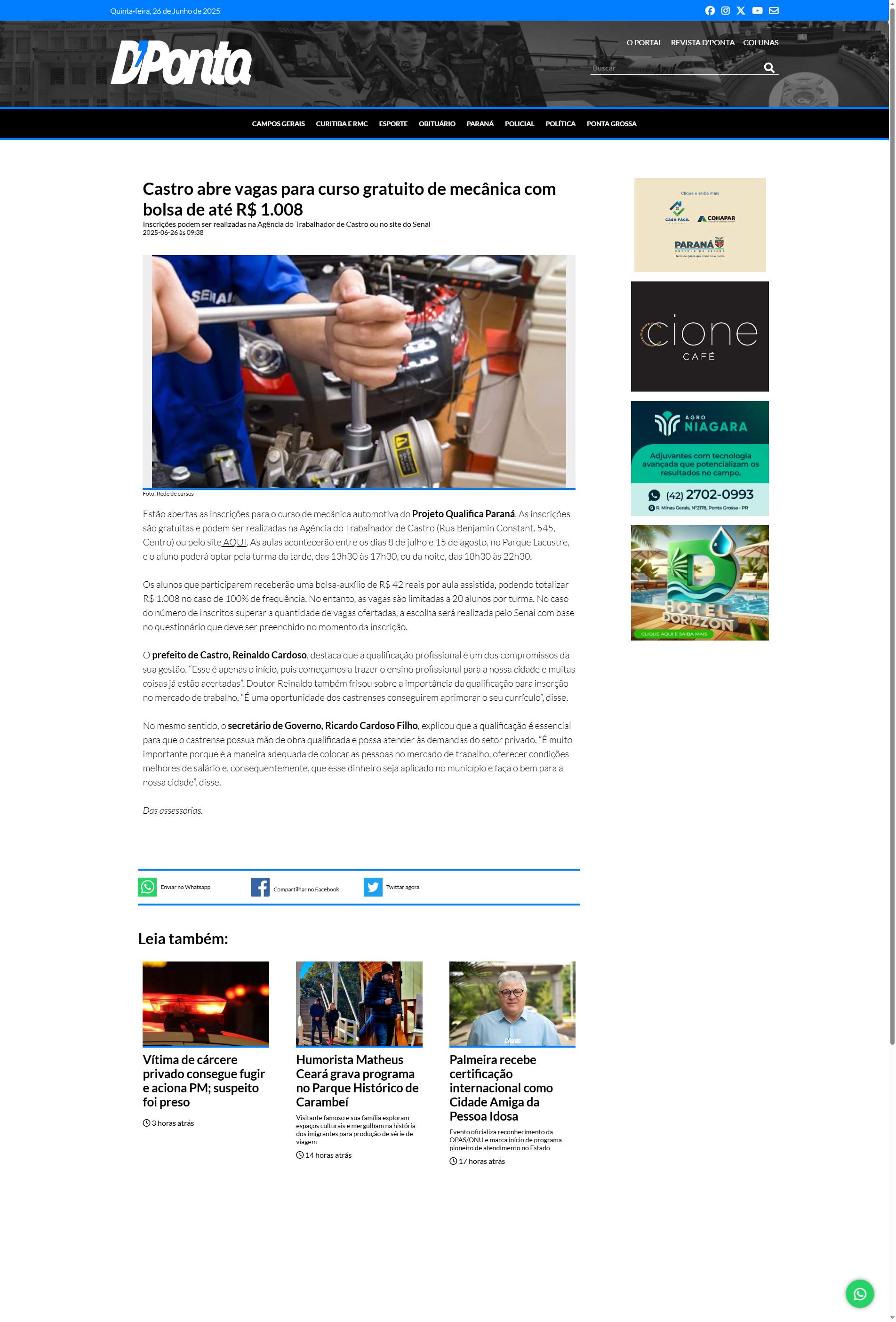 Agência do Trabalhador de Castro (Rua Benjamin Constant, 545, Centro) ou pelo site AQUI. As aulas acontecerão entre os dias 8 de julho e 15 de agosto, no Parque Lacustre, e o aluno poderá optar pela turma da tarde, das 13h30 às 17h30, ou da noite, das 18h30 às 22h30.