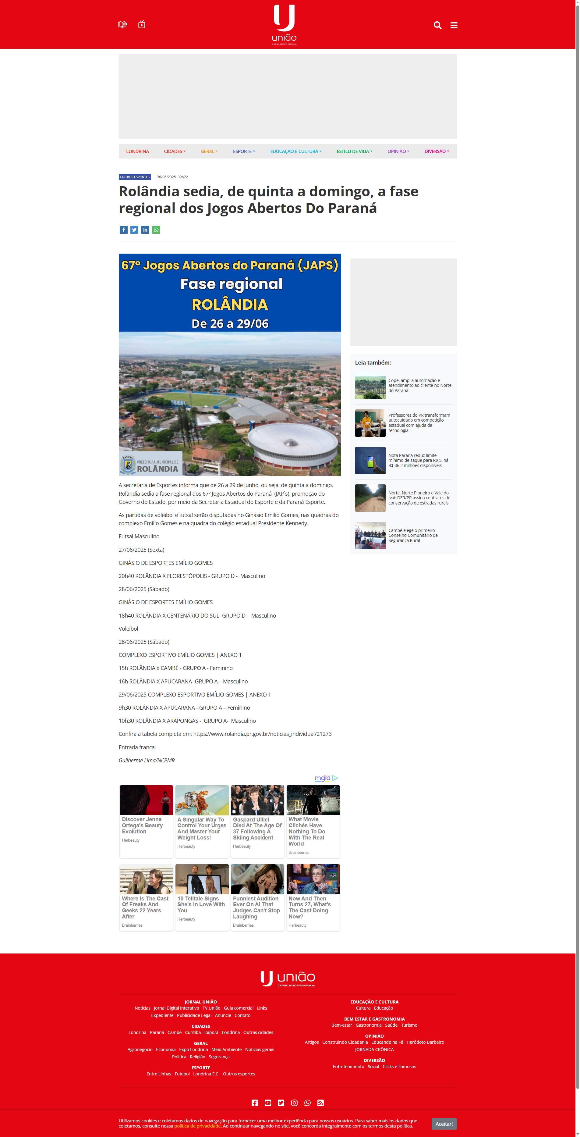 A secretaria de Esportes informa que de 26 a 29 de junho, ou seja, de quinta a domingo, Rolândia sedia a fase regional dos 67º