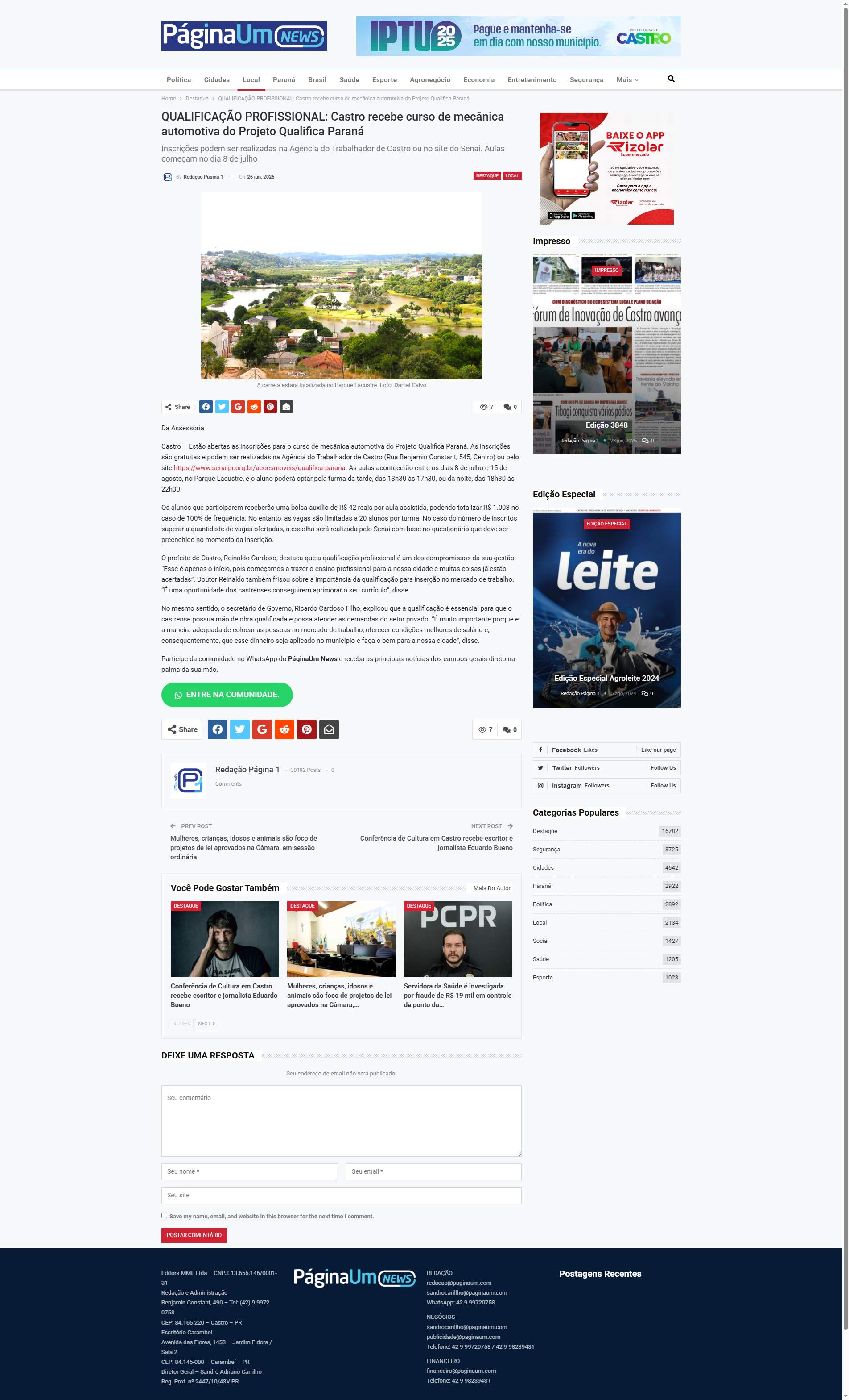 Agência do Trabalhador de Castro (Rua Benjamin Constant, 545, Centro) ou pelo site https://www.senaipr.org.br/acoesmoveis/qualifica-parana. As aulas acontecerão entre os dias 8 de julho e 15 de agosto, no Parque Lacustre, e o aluno poderá optar pela turma da tarde, das 13h30 às 17h30, ou da noite, das 18h30 às 22h30.